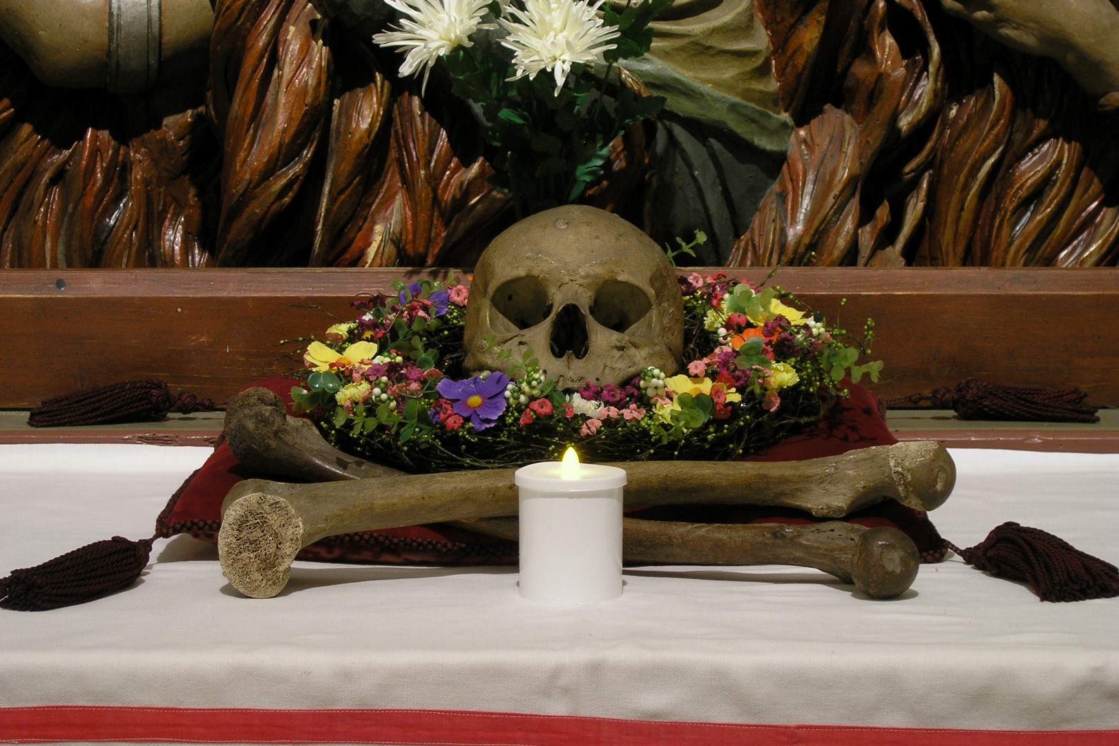 mit den beiden Knochen, dem Blumenkranz und den Lichtern (© Herr Mag. Bernhard Wagner).