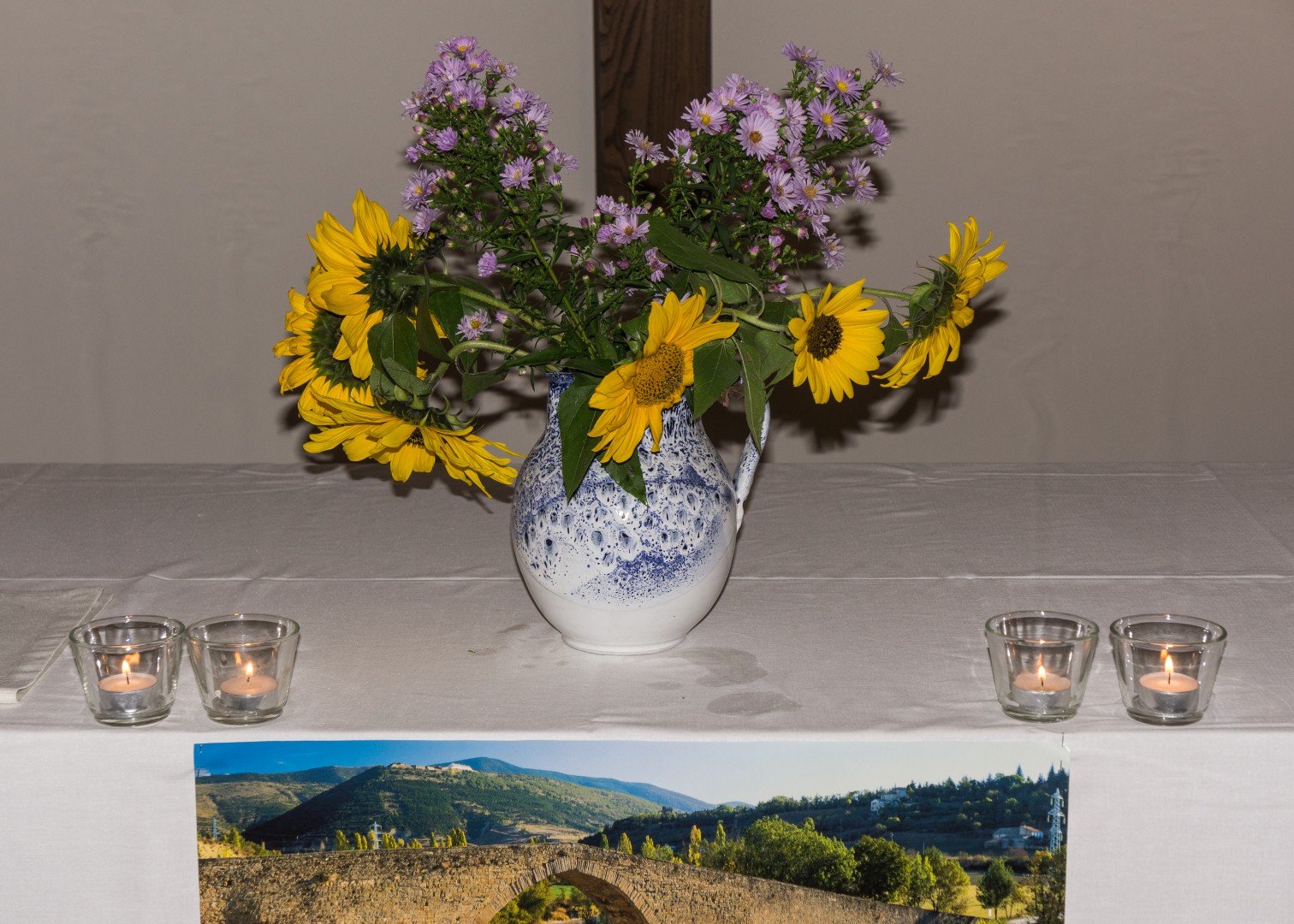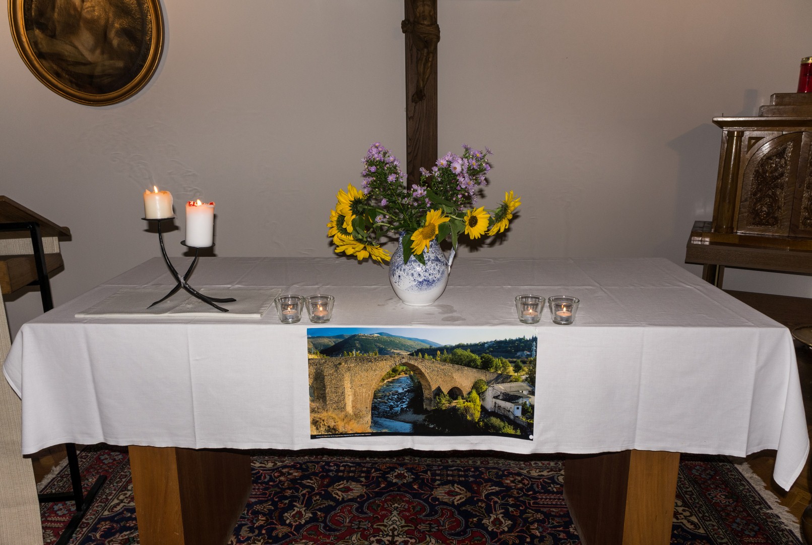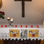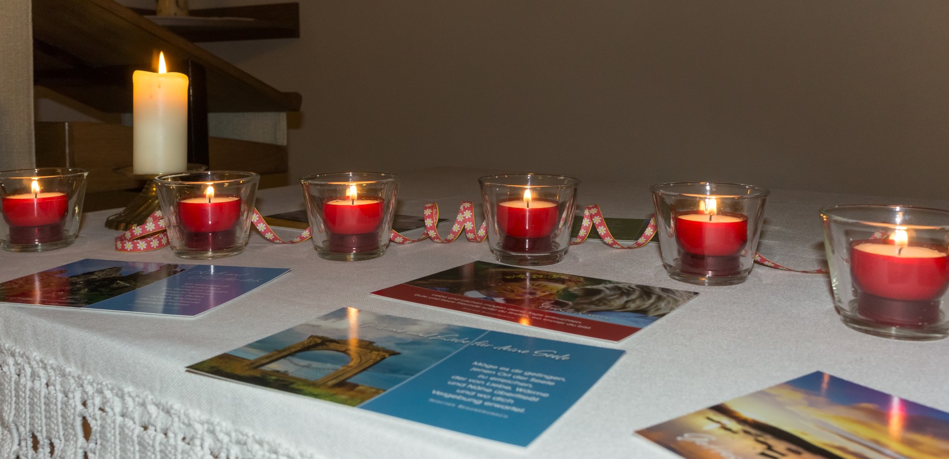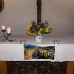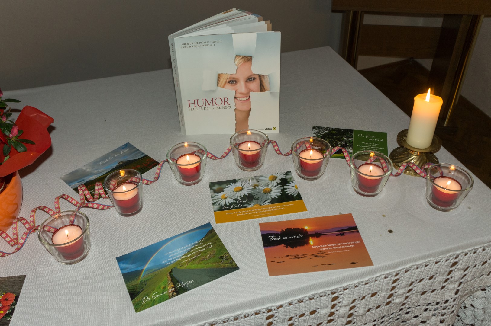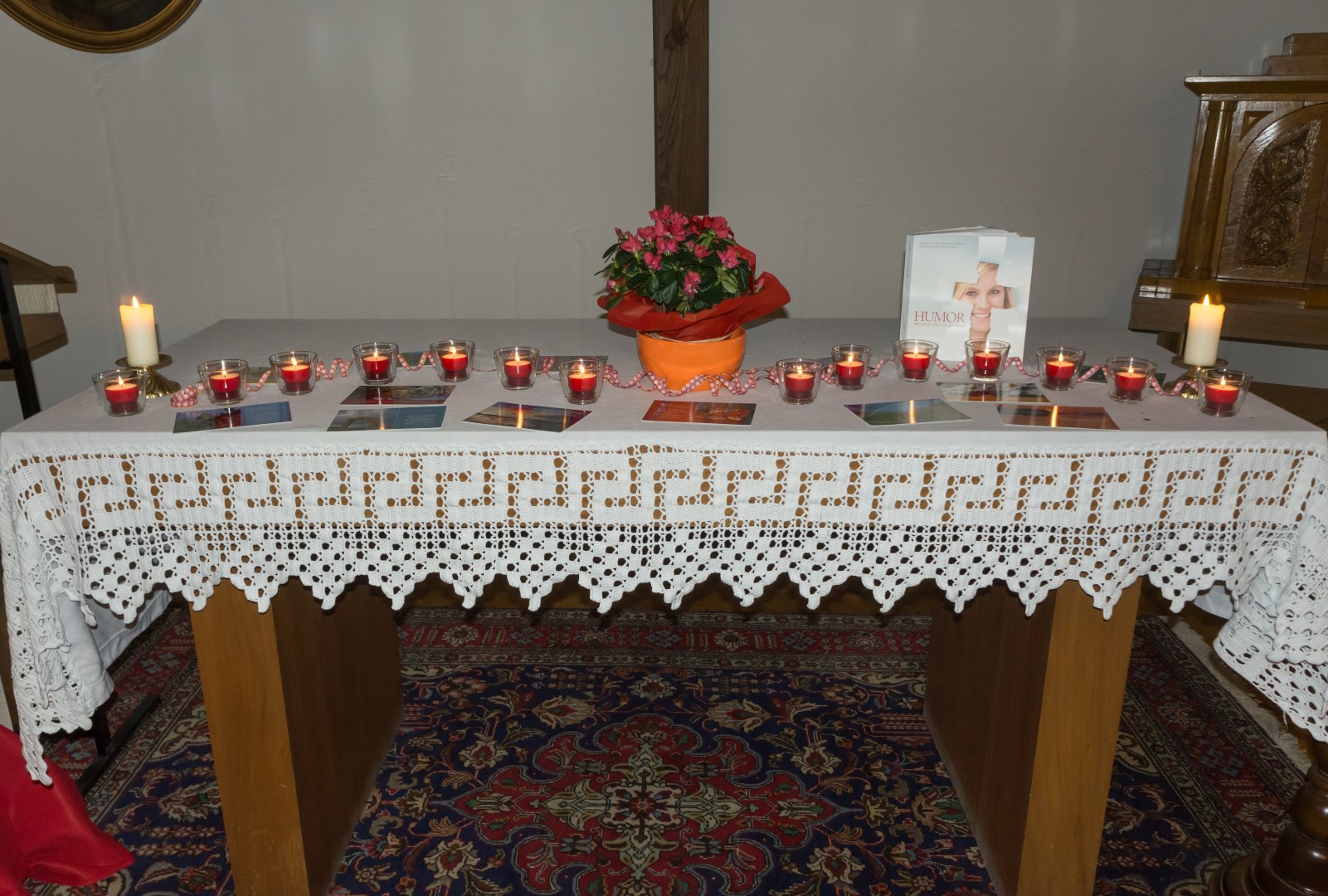 Am Altar liegen Postkarten mit schönen Sprüchen und Segenswünschen bereit wovon sich jede Teilnehmerin und jeder Teilnehmer ein Exemplar mit nach Hause nehmen kann (© Herr Mag. Bernhard Wagner).