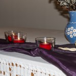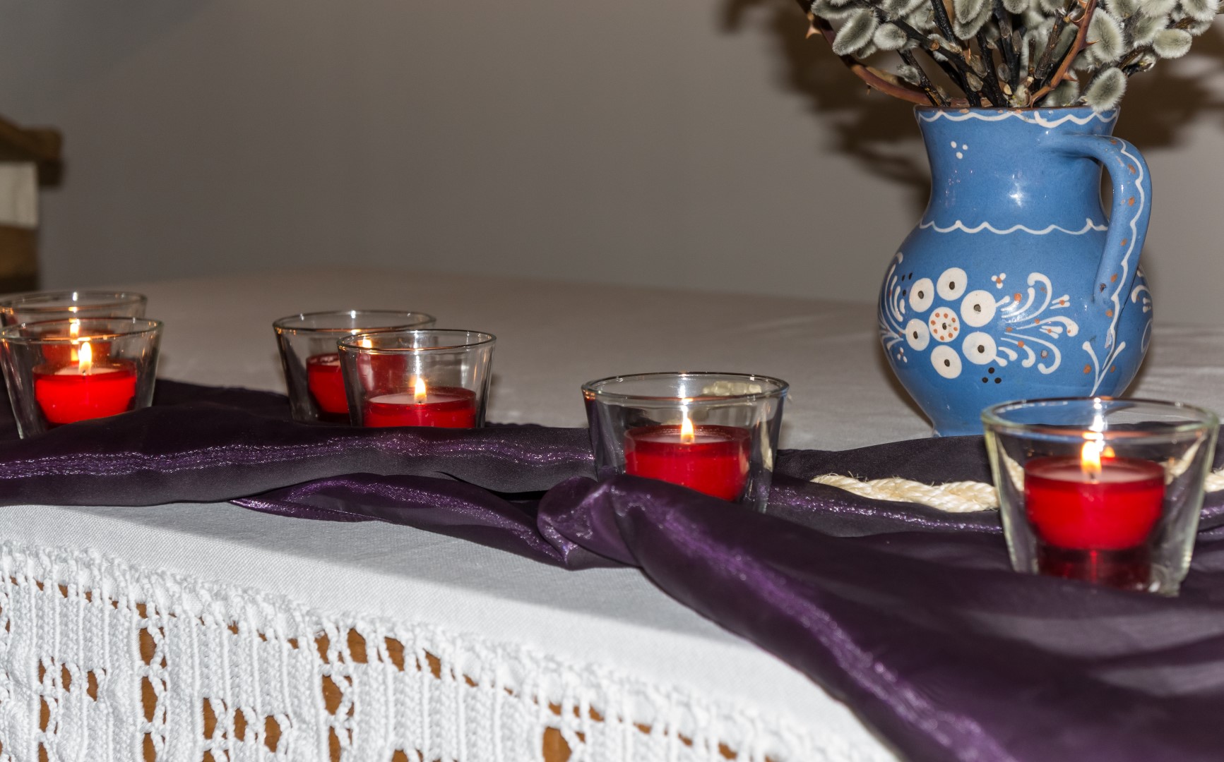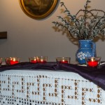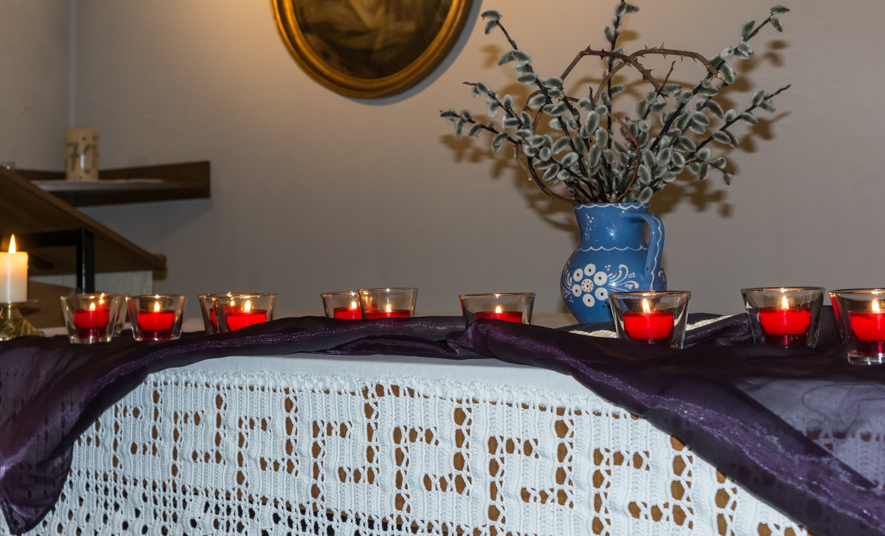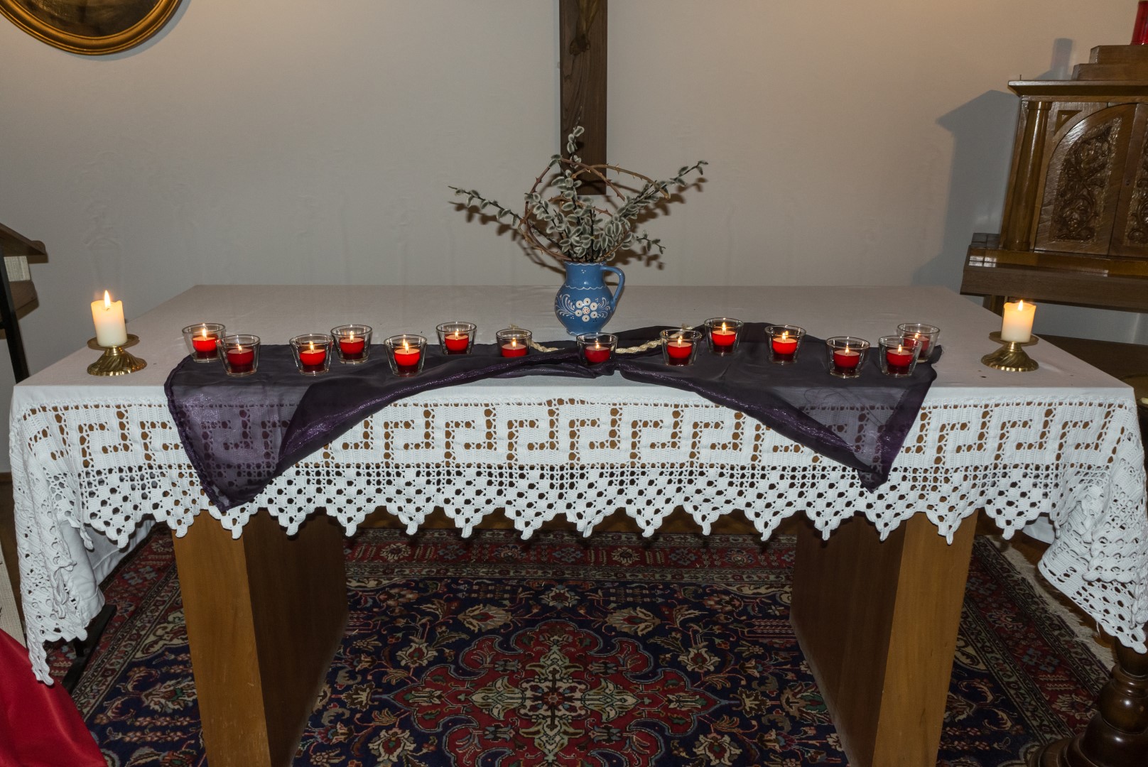 In der Fastenzeit ist Violett die liturgische Farbe, hier durch das Seidentuch repräsentiert. Das Seilstück vor der Vase kann als Hinweis auf die Fesselung Jesu verstanden werden (© Herr Mag. Bernhard Wagner).
