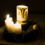 Adventkranz mit zentraler Osterkerze; Sinnbild des Zusammenhangs der beiden größten Feste im Kirchenjahr (© Herr Mag. Bernhard Wagner).