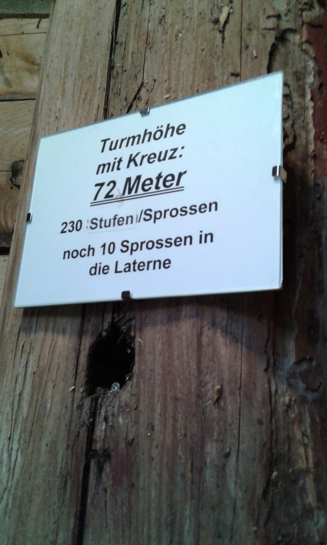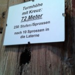 Tafel im Zwiebelhelm mit Angabe zur Turmhöhe und Stufen-/Sprossenanzahl (© Herr Christian Cufer).
