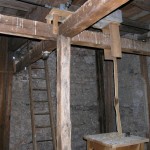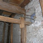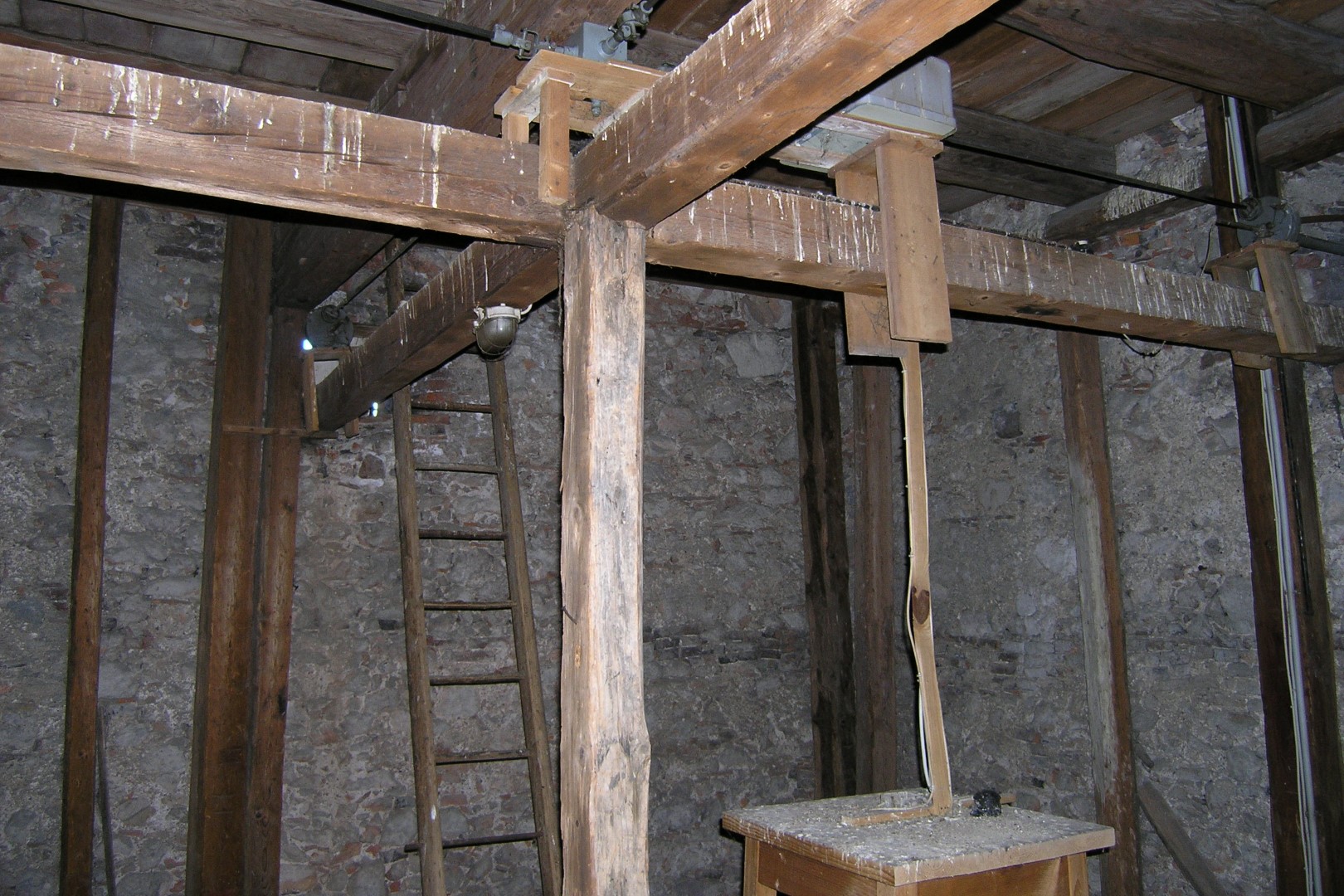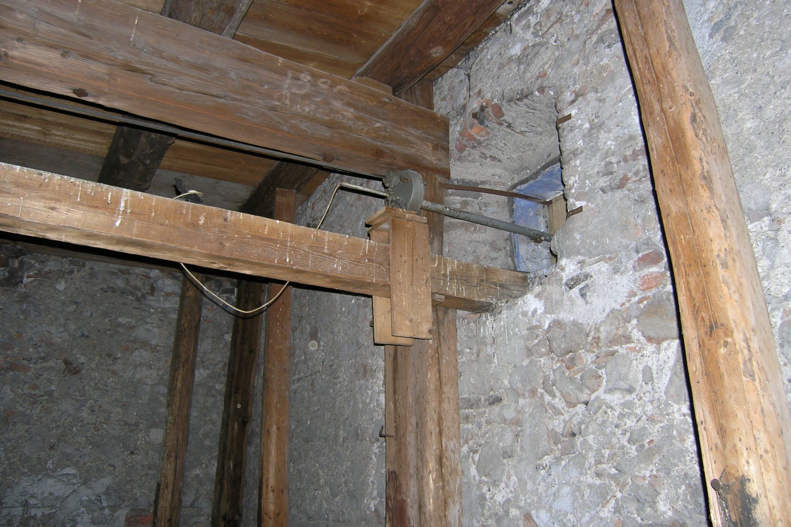 Kreuzungsstelle der vier Antriebsstangen für die Uhrzeiger des Kirchturms inmitten des Uhrraums (© Herr Mag. Bernhard Wagner).