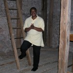 Herr Mag. Eliseus Ezeuchenne bei der Leiter hinauf in den Zwiebelhelm des Kirchturms (© Herr Mag. Bernhard Wagner).