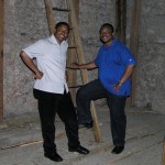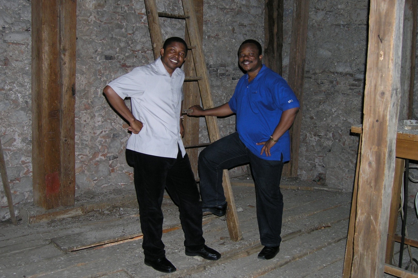 Herr Charles Ogbunambala (links) und Herr Mag. Eliseus Ezeuchenne bei der Leiter hinauf in den Zwiebelhelm des Kirchturms (© Herr Mag. Bernhard Wagner).