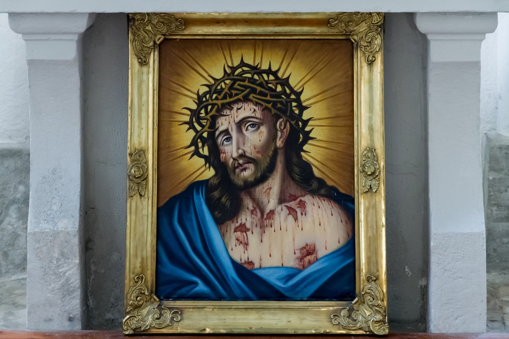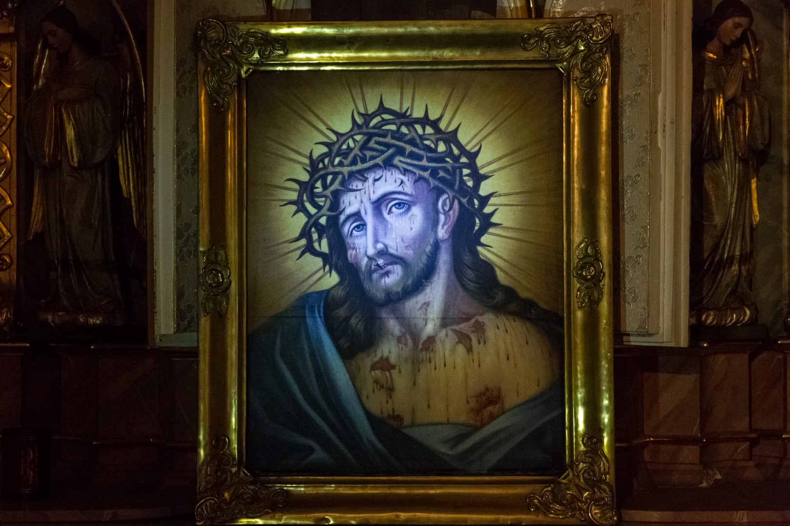 Bildnis des dornengekrönten Hl. Hauptes vor dem Tabernakel des Hochaltars in mystischem Licht (© Herr Mag. Bernhard Wagner).