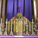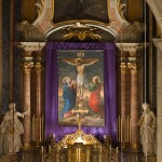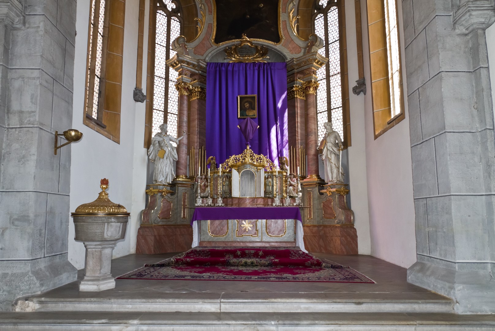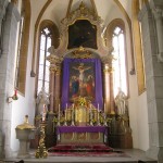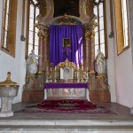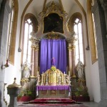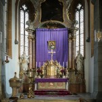 Blick auf den Hochaltar mit dem verhüllten Kreuz und dem im Hintergrund befindlichen Bildnis des Hl. Hauptes. Der Tabernakel steht offen zumal das Allerheiligste am Gründonnerstag zum Herz Jesu-Altar übertragen wurde (© Herr Mag. Bernhard Wagner).
