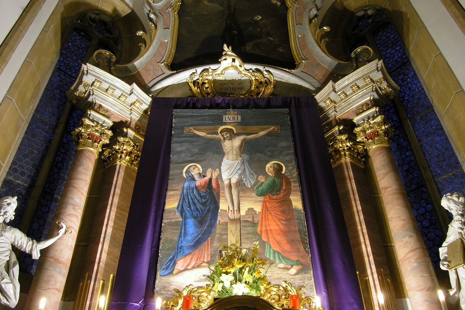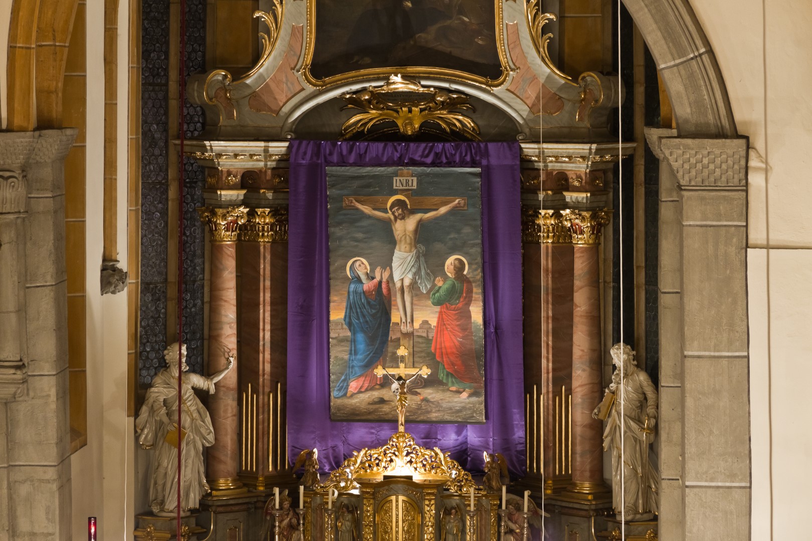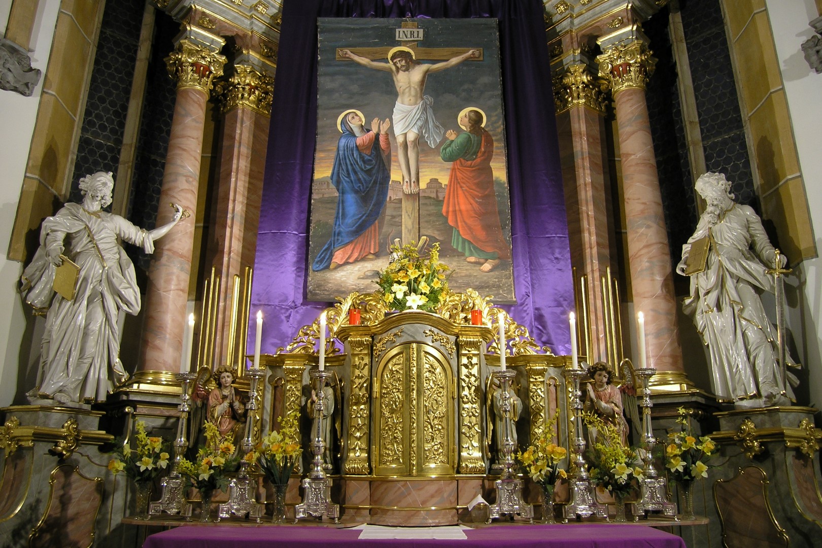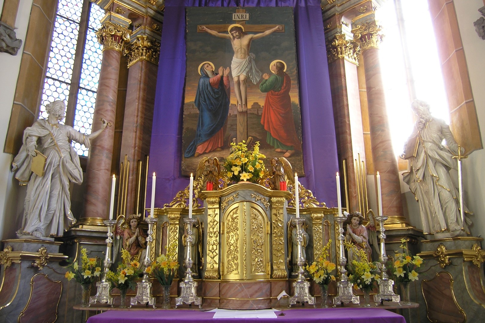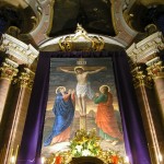 Bereich des Hochaltars um den Tabernakel. Darüber das Fastenbild mit Jesus am Kreuz, seiner Mutter Maria (links) und dem Jünger Johannes (rechts) (© Herr Mag. Bernhard Wagner).