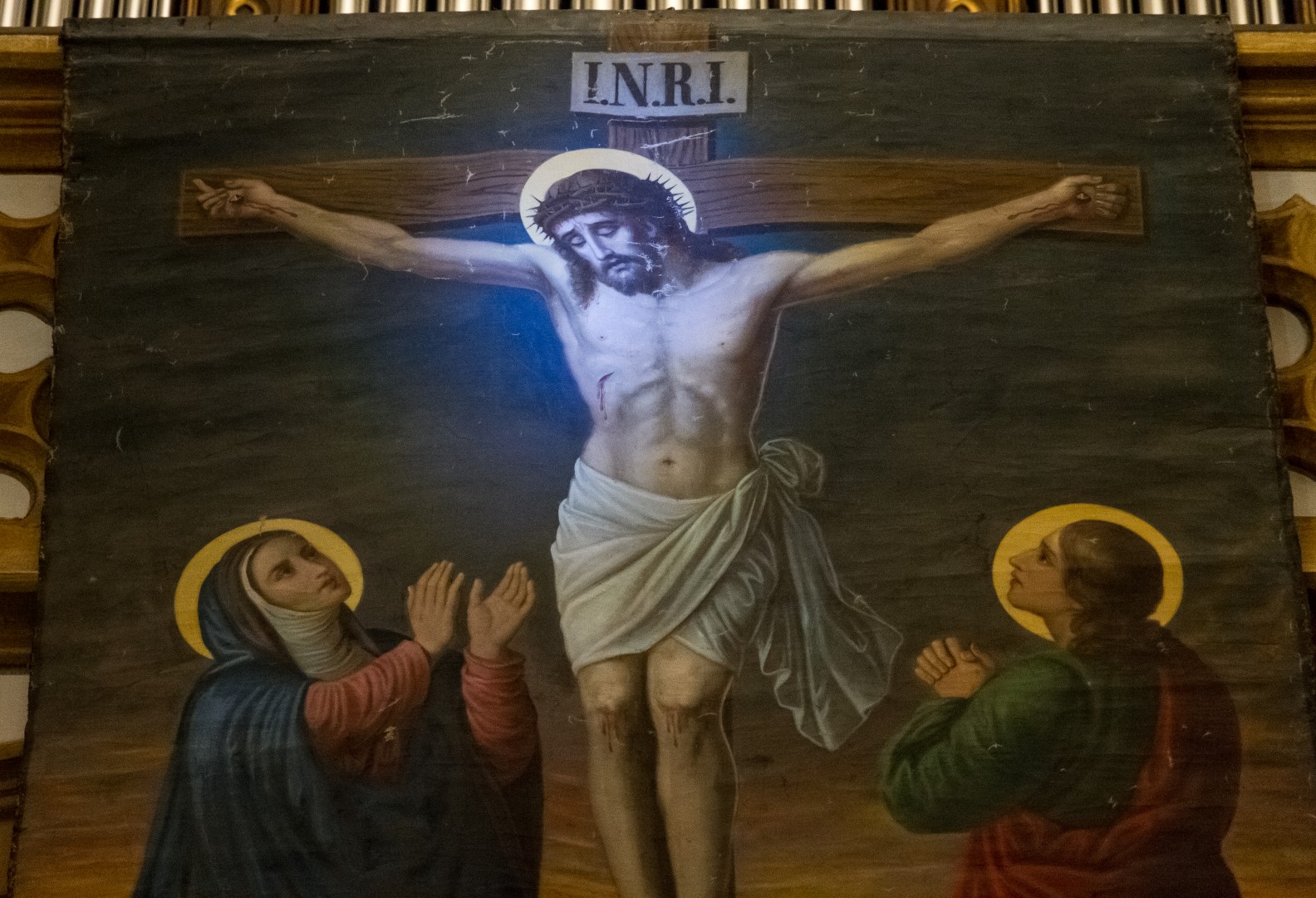 Das Fastenbild mit der Kreuzigungsszene, in diesem Jahr seit Beginn der Hauptandacht erstmals von der Orgelempore herabhängend. Das Haupt Jesu wurde durch den Schein einer Lampe zusätzlich hervorgehoben wobei deren kühles Licht einen besonderen Kontrast zum warmen Licht der Umgebung darstellt (© Herr Mag. Bernhard Wagner).
