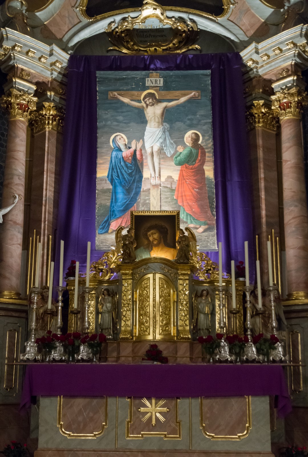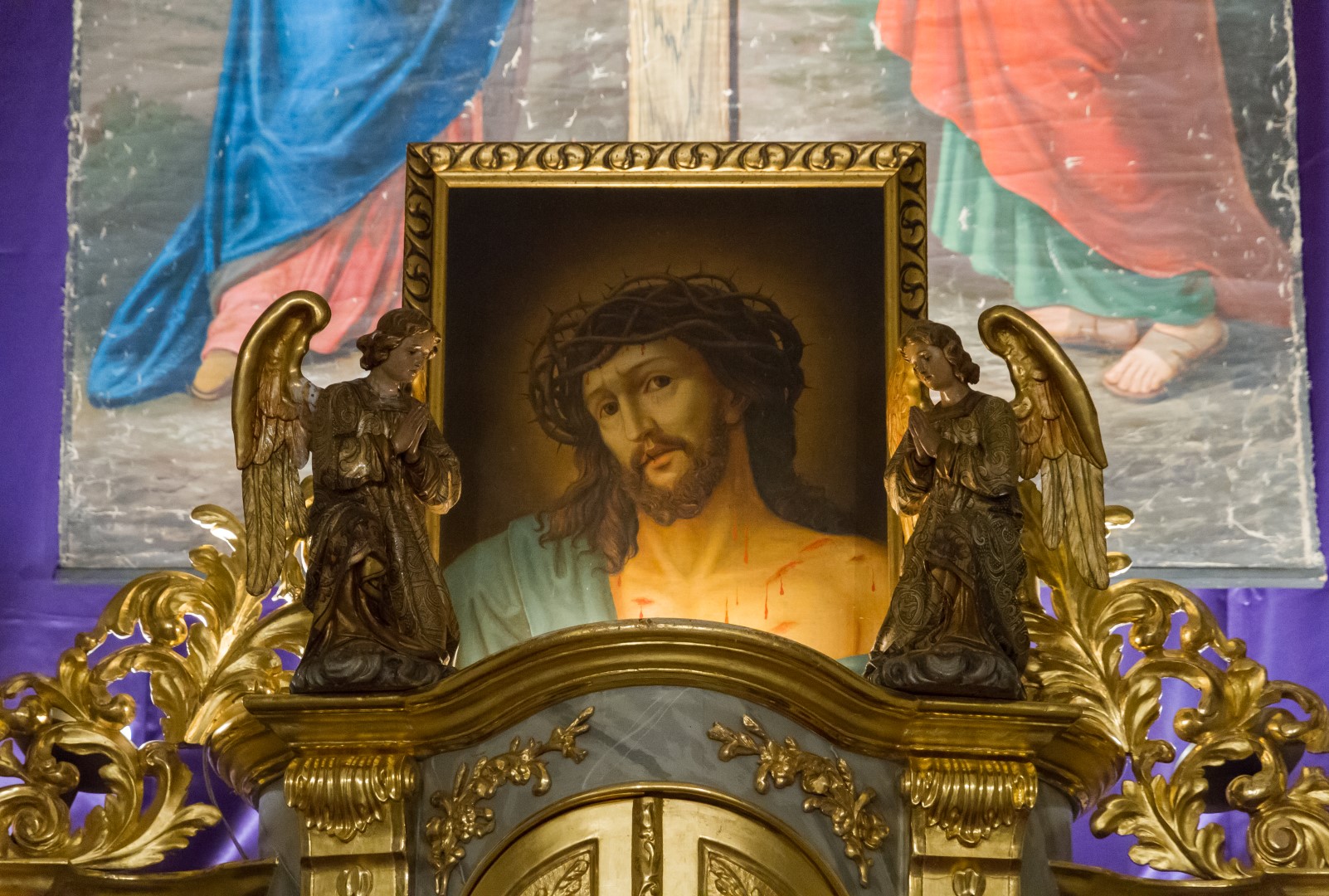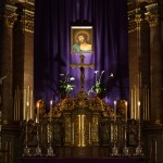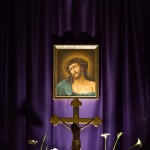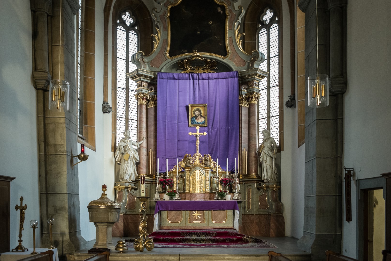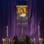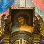 Das klassische Bild des Hl. Hauptes am Hochaltar vor dem violetten Vorhang (© Herr Mag. Bernhard Wagner).