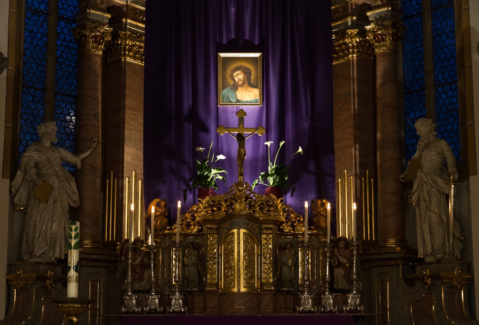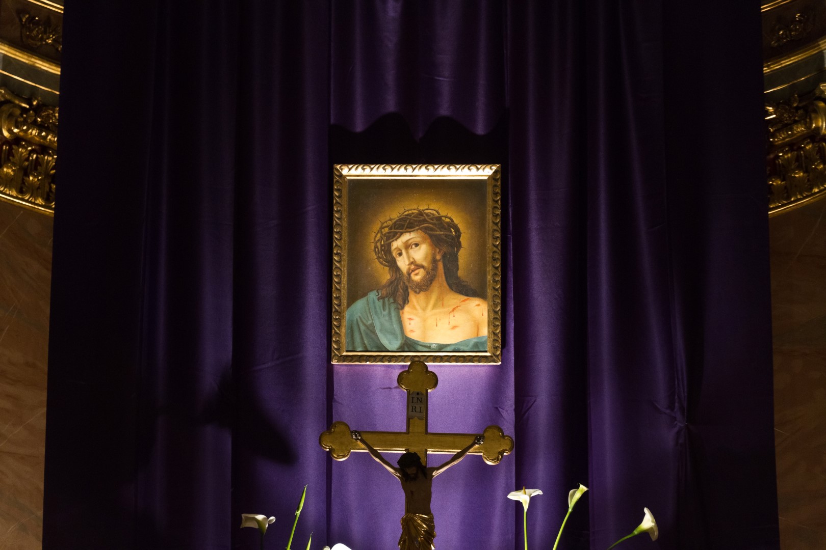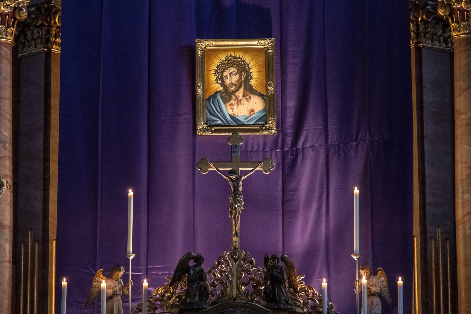 Das klassische Bild des Hl. Hauptes am Hochaltar vor dem violetten Vorhang (© Herr Mag. Bernhard Wagner).
