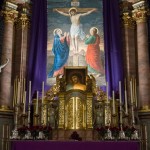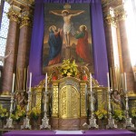 Bereich des Hochaltars um den Tabernakel und das Fastenbild in abendlicher Beleuchtung (© Herr Mag. Bernhard Wagner).