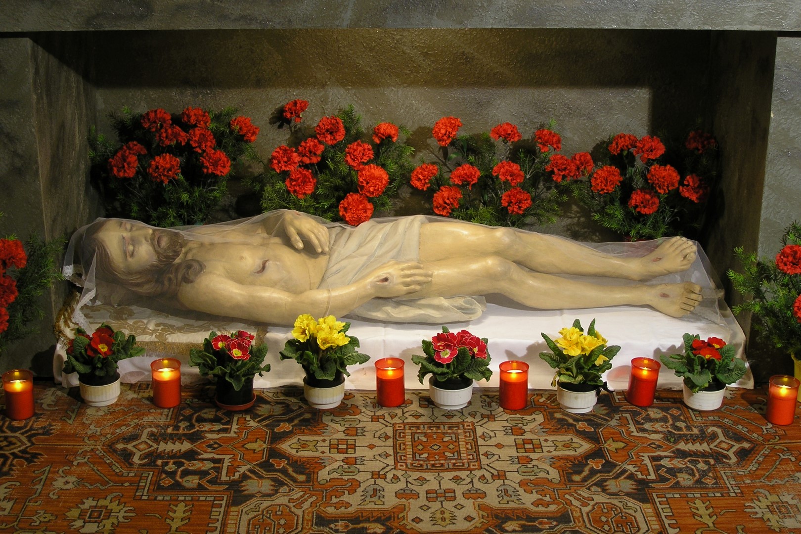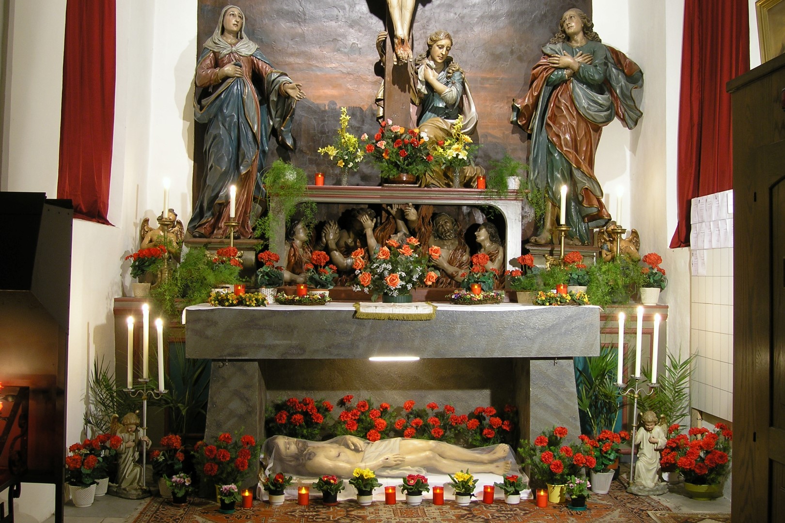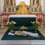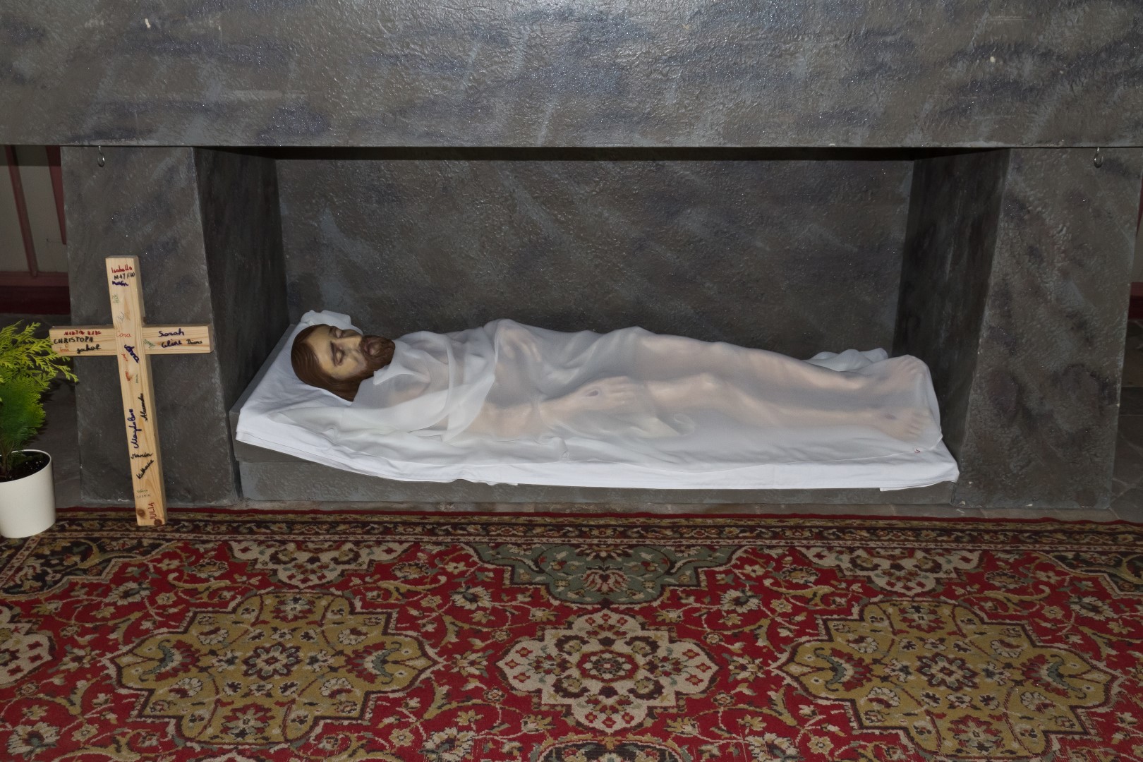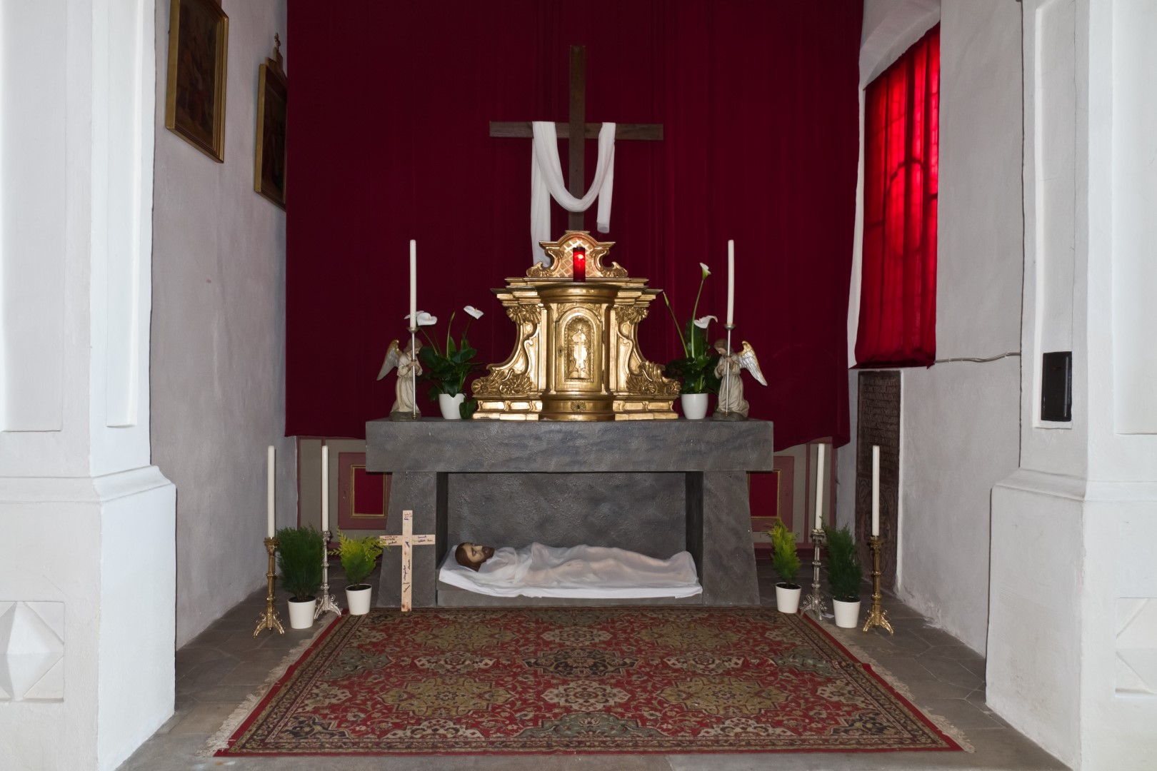 Der im Heiligen Grab ruhende Heiland, links das beim Kinderkreuzweg am Tag zuvor mitgetragene Kreuz (© Herr Mag. Bernhard Wagner).