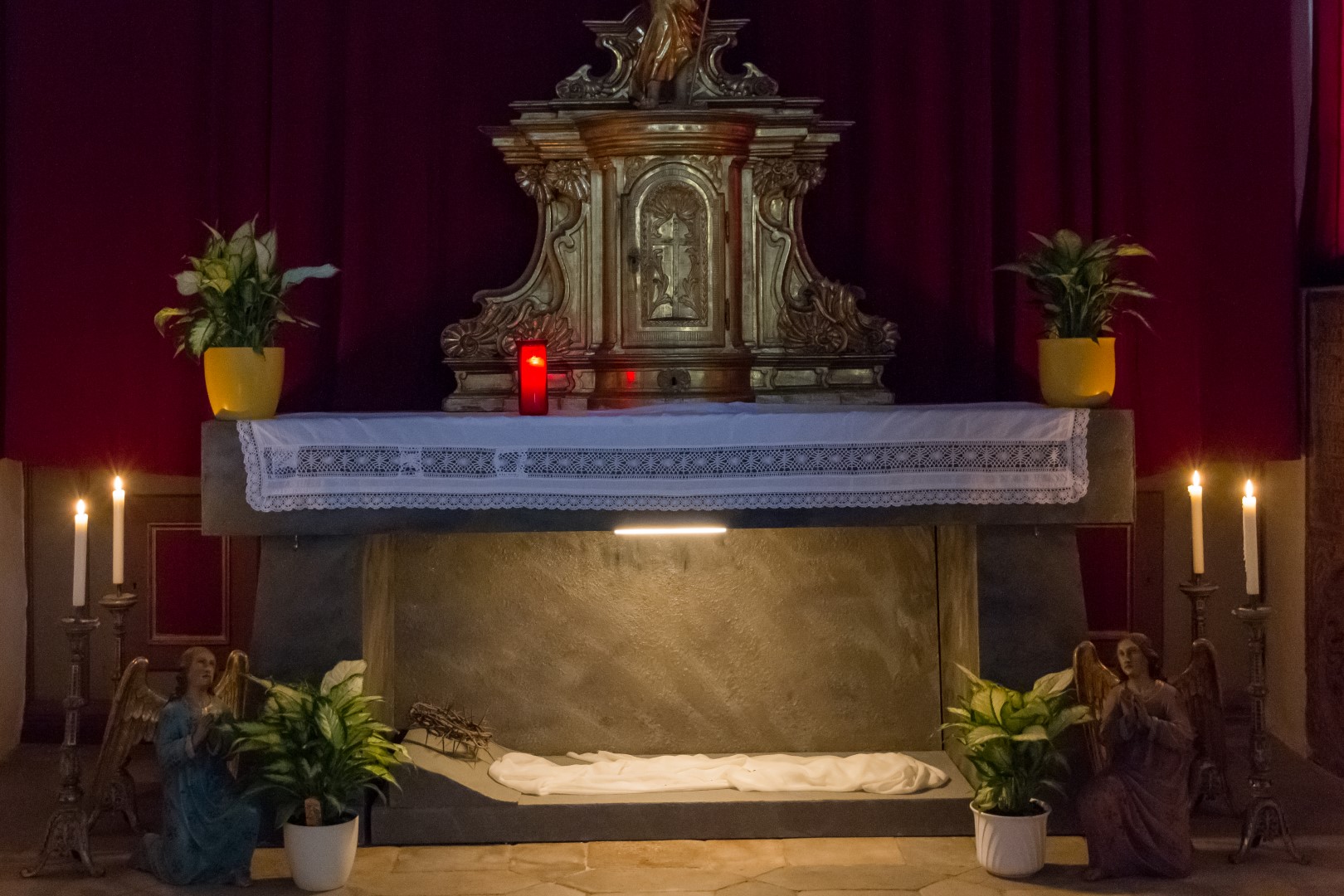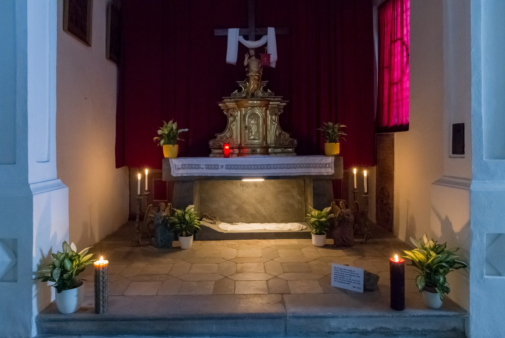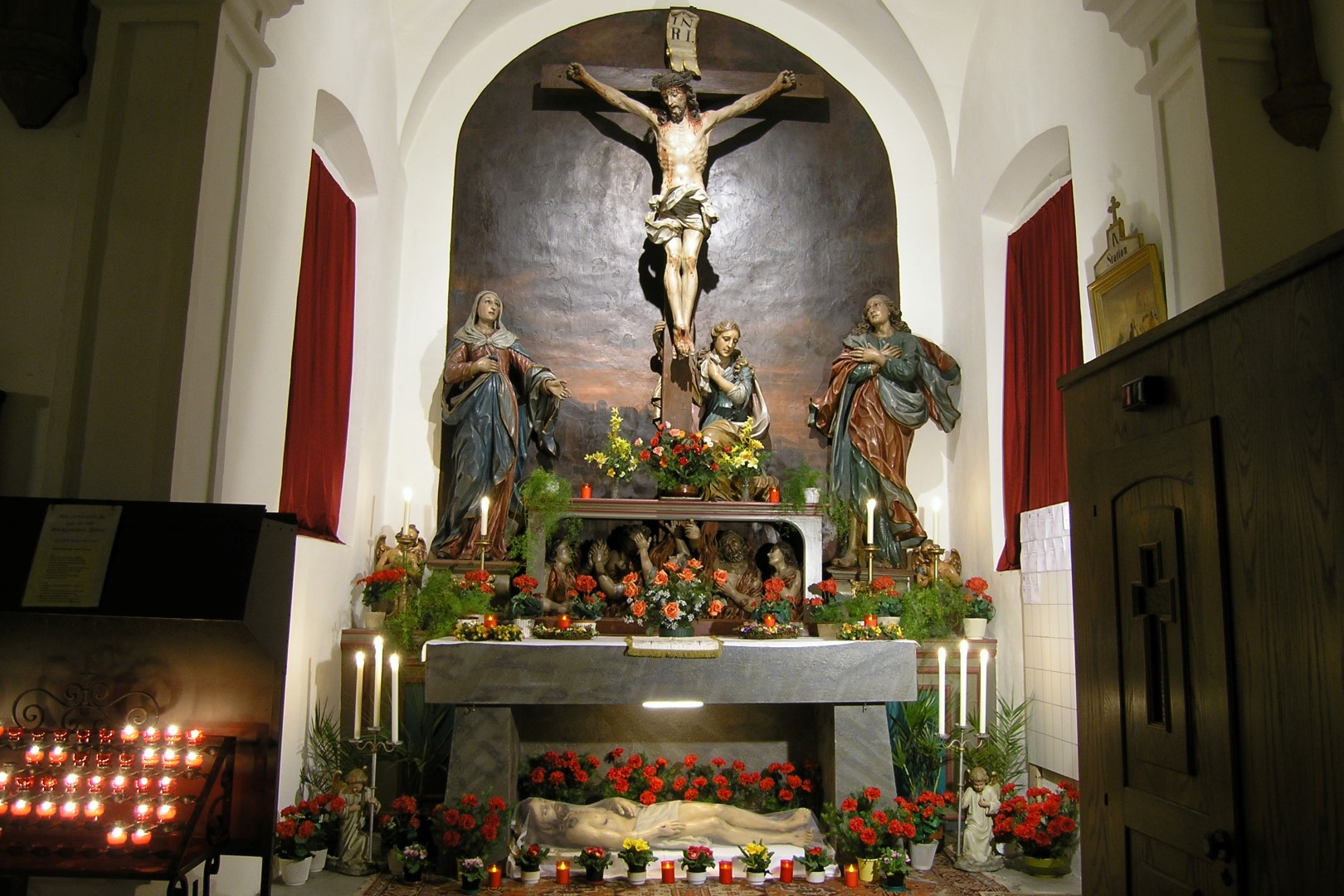Gesamtansicht des Heiligen Grabes beim Herz Jesu-Altar in abendlicher Beleuchtung (© Herr Mag. Bernhard Wagner).