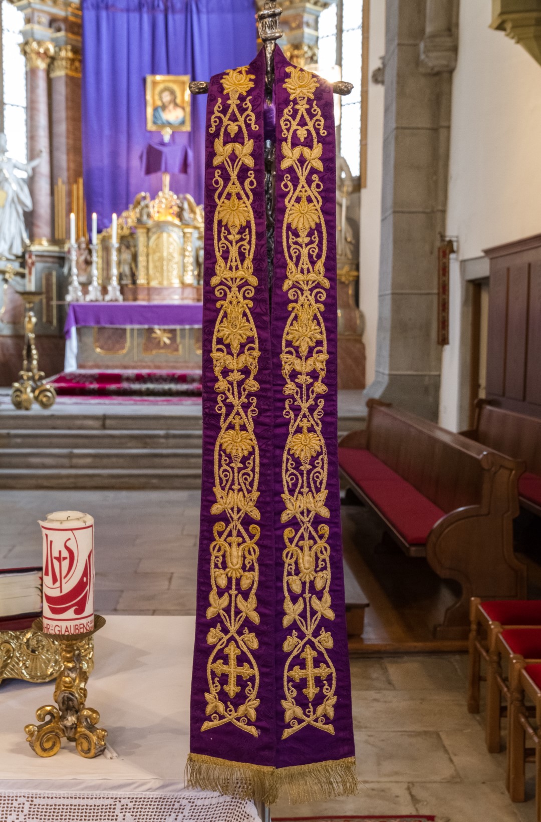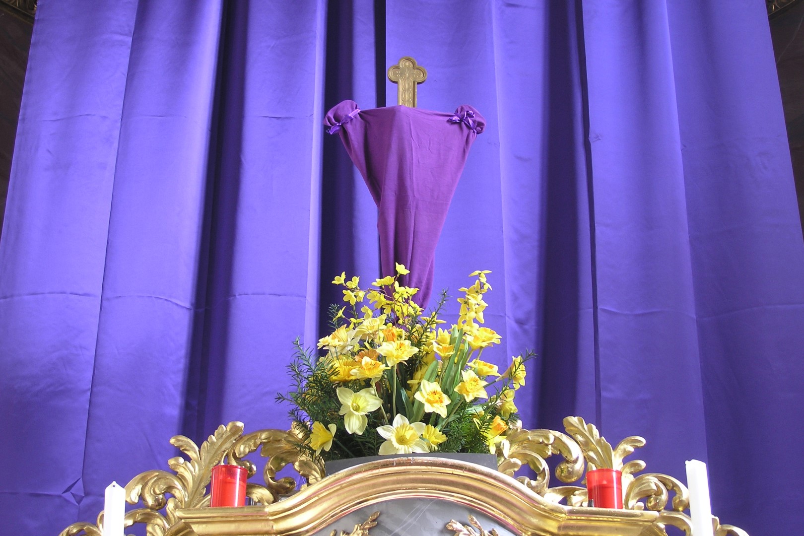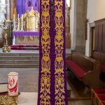 mittels einer violetten Stola. Ab dem auch Passionssonntag genannten 5. Fastensonntag ist es üblich, die Kreuze in