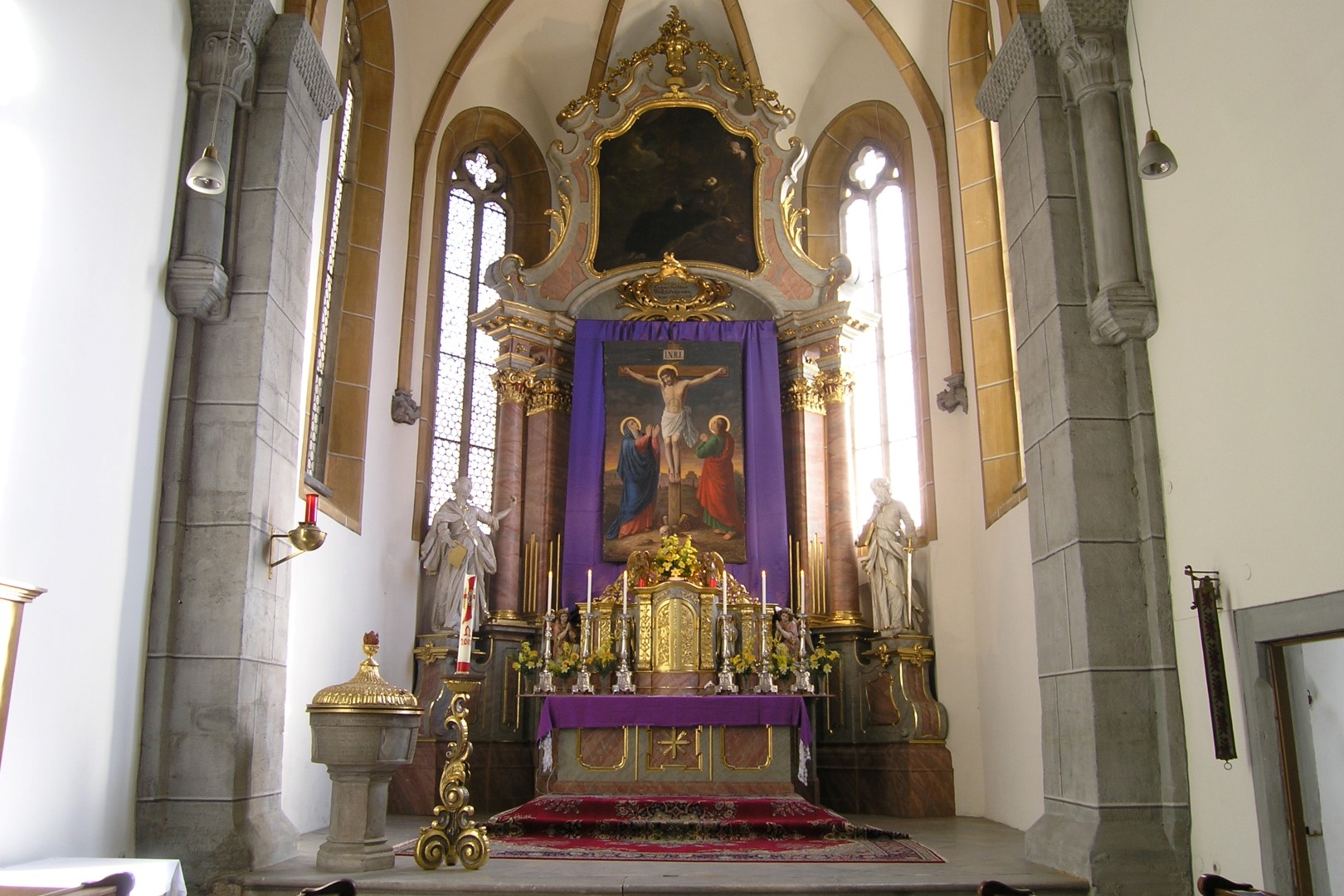 Gesamtansicht des Hochaltars mit dem verhüllten Kreuz und dem Blumengesteck (© Herr Mag. Bernhard Wagner).
