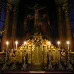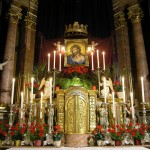 Bereich des Hochaltars um den Tabernakel mit dem Hauptandachtsaufbau in abendlicher Beleuchtung (© Herr Mag. Bernhard Wagner).