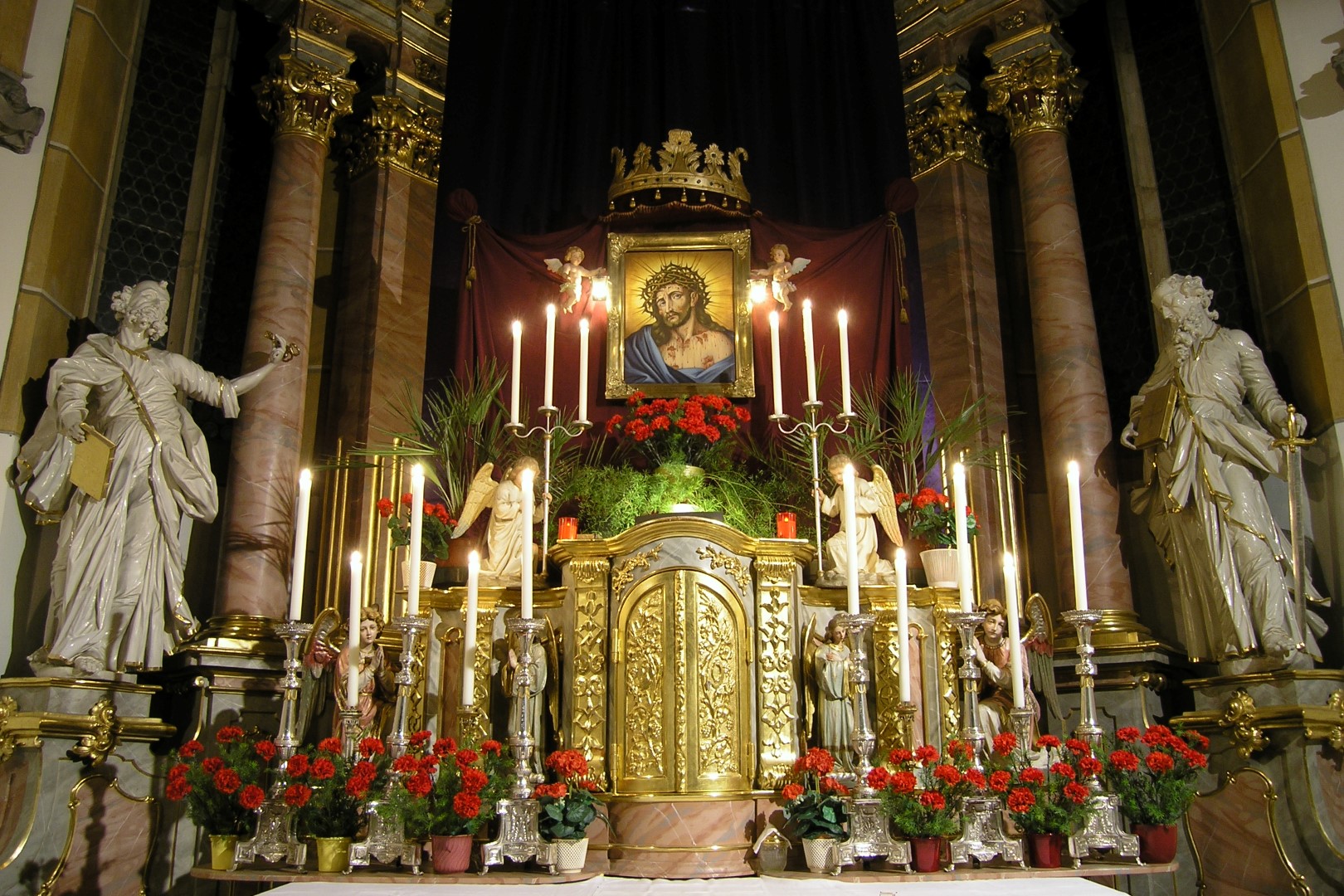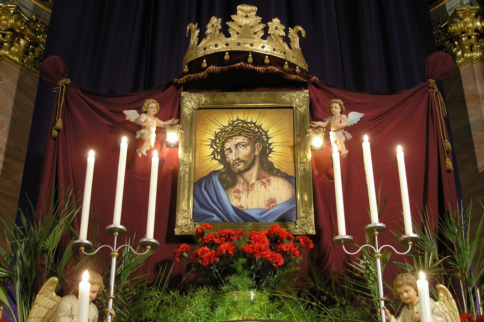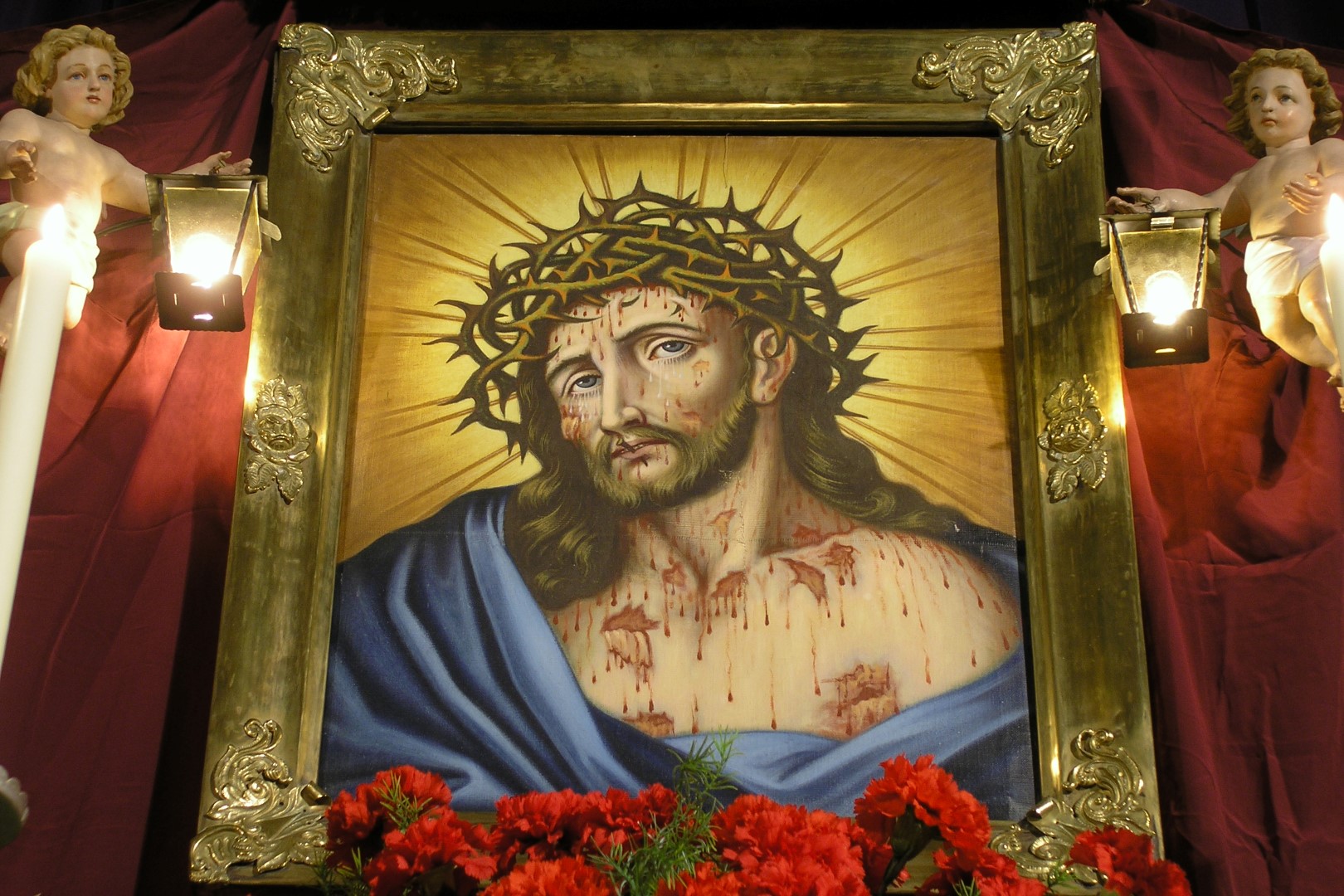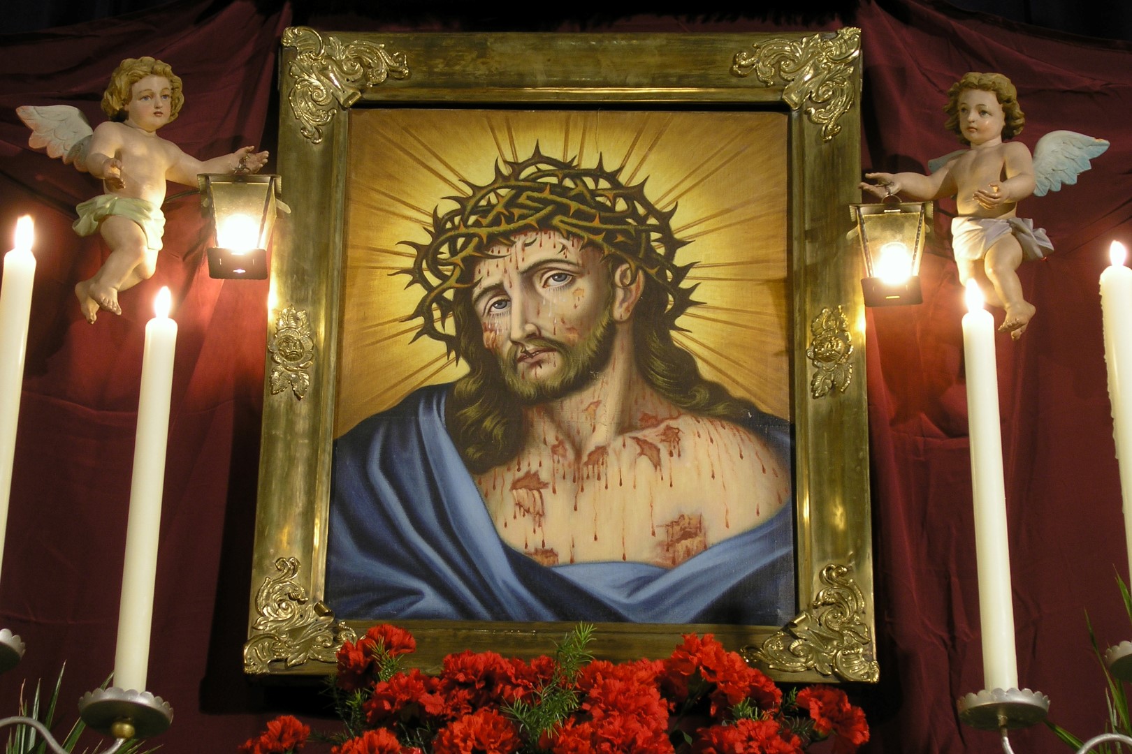 Das Bild des Hl. Hauptes flankiert von zwei Engeln mit Laternen. Davor ein Nelkengesteck mit roten, Blutstropfen symbolisierenden Nelken (© Herr Mag. Bernhard Wagner).