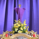 Verhülltes Kreuz mit Blumengesteck über dem Tabernakel (© Herr Mag. Bernhard Wagner).