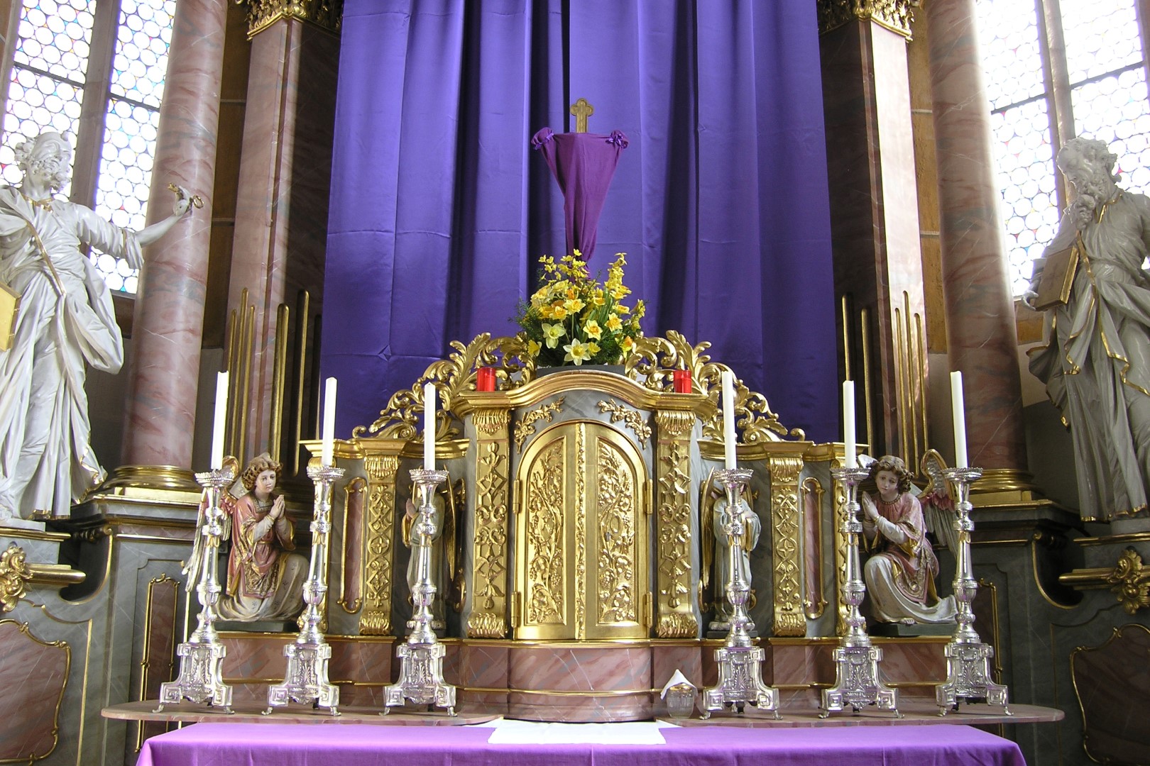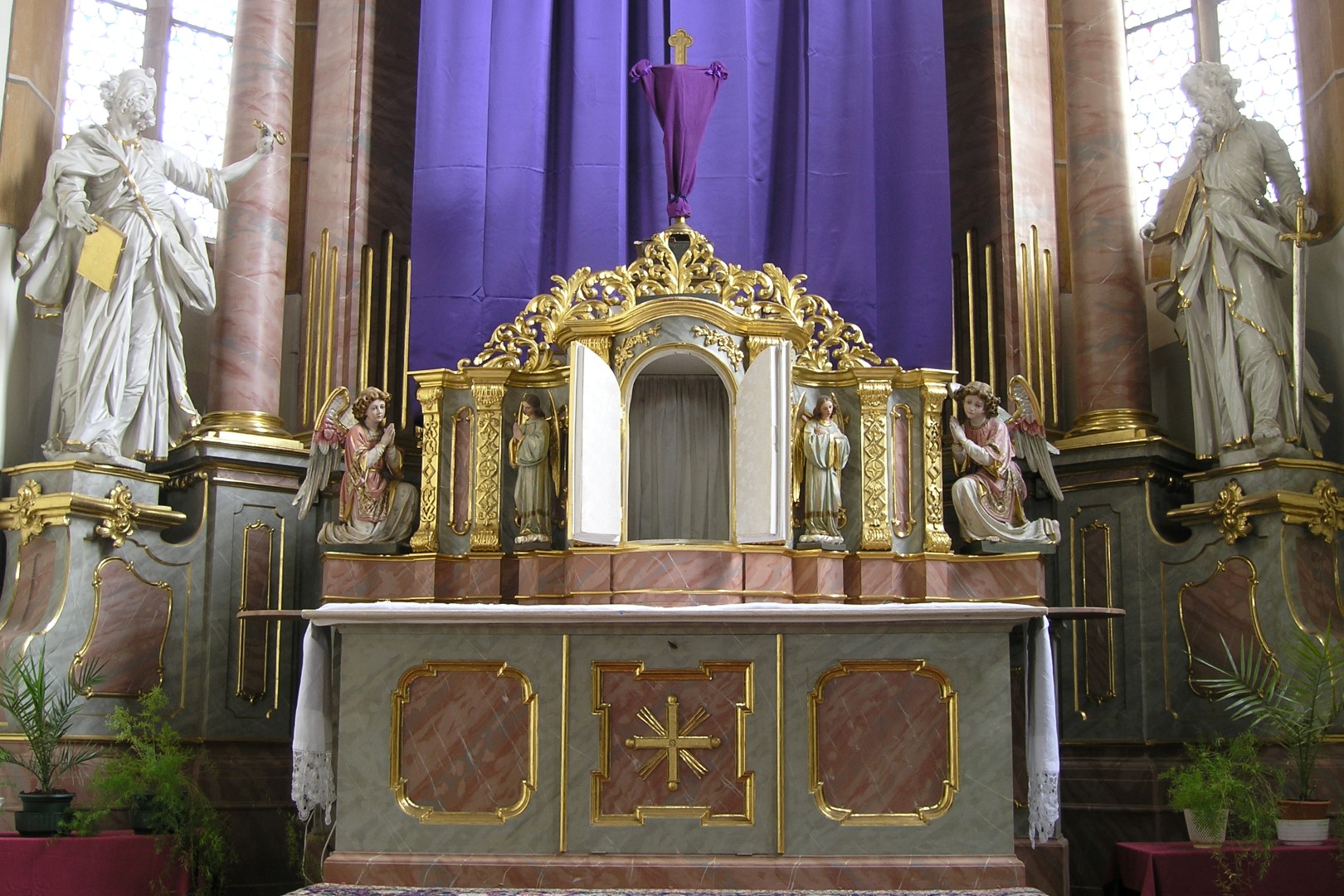 Bereich des Hochaltars um den Tabernakel. Darüber das verhüllte Kreuz mit dem Blumengesteck (© Herr Mag. Bernhard Wagner).