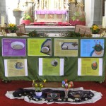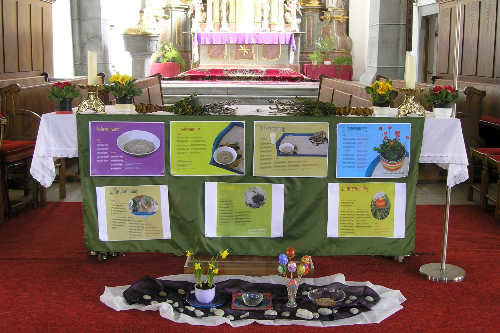 Der Volksaltar mit Texten und Bildern zum Aschermittwoch und den einzelnen Fastensonntagen sowie Fasten- und Ostersymbolen der Gruppe um Frau Monika Wuggenig (© Herr Mag. Bernhard Wagner).
