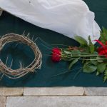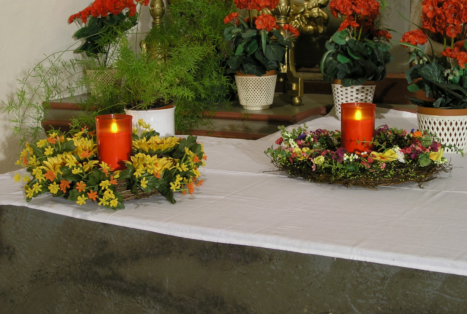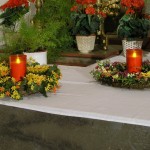 Rechtsseitige Blumenkränze mit Lichtern am Heiligen Grab (© Herr Mag. Bernhard Wagner).