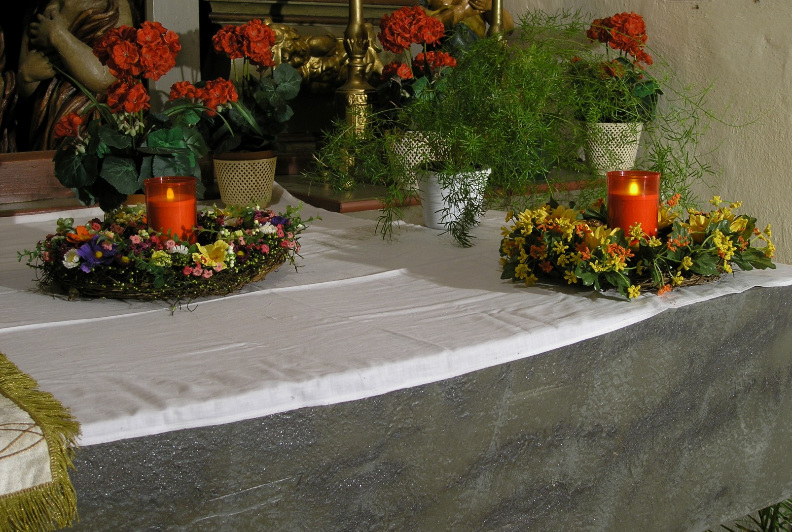 Tabernakel des Herz Jesu-Altars mit Blumenschmuck sowie zwei Kerzen und verschiedenen Lichtern in abendlicher Beleuchtung (© Herr Mag. Bernhard Wagner).