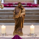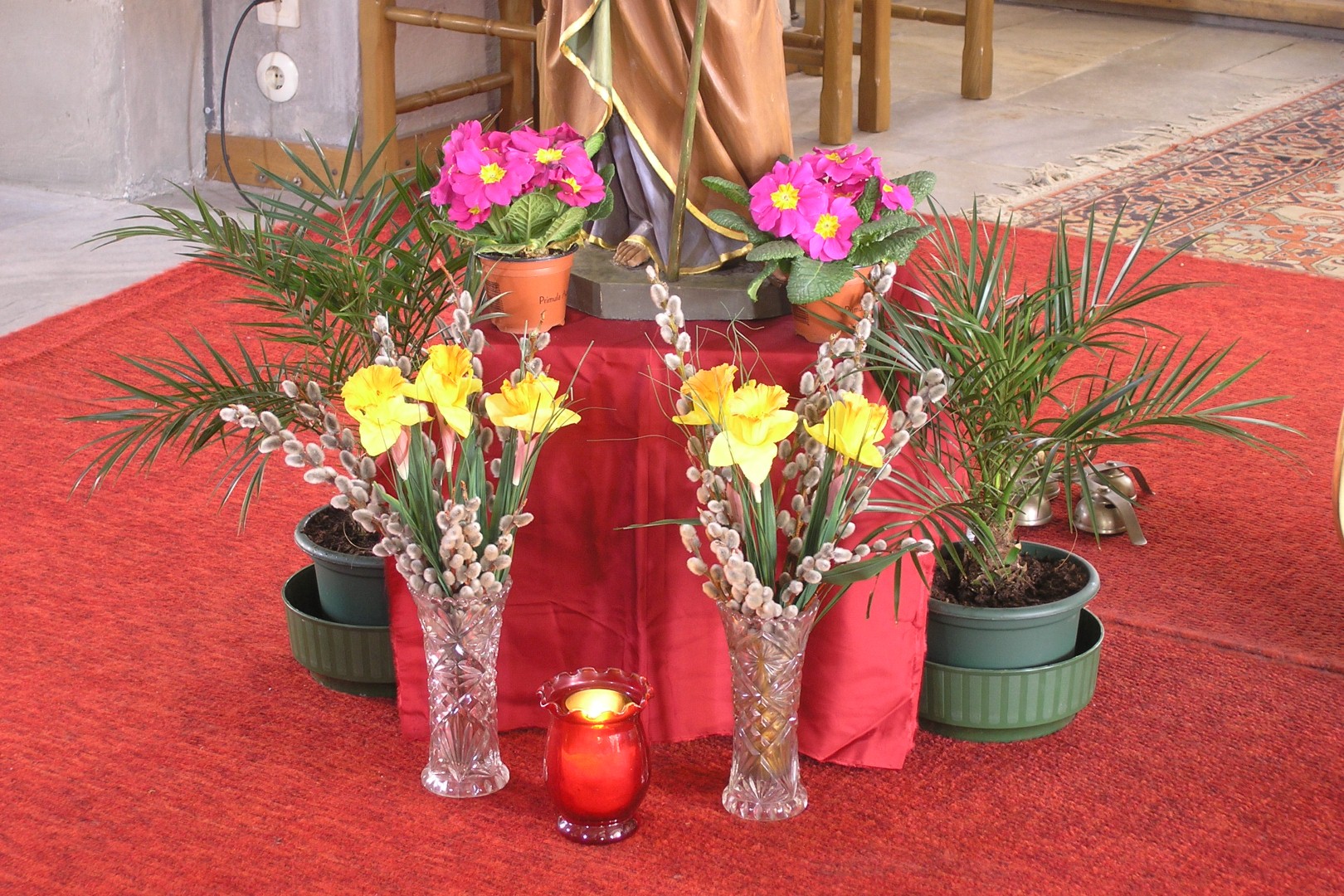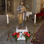 Eine andere, ebenfalls mit Blumen geschmückte Statue des Heiligen, flankiert von zwei Kerzenleuchtern mit brennenden Kerzen neben dem Volksaltar. Hier hält er nur die weiße Lilie (© Herr Mag. Bernhard Wagner).