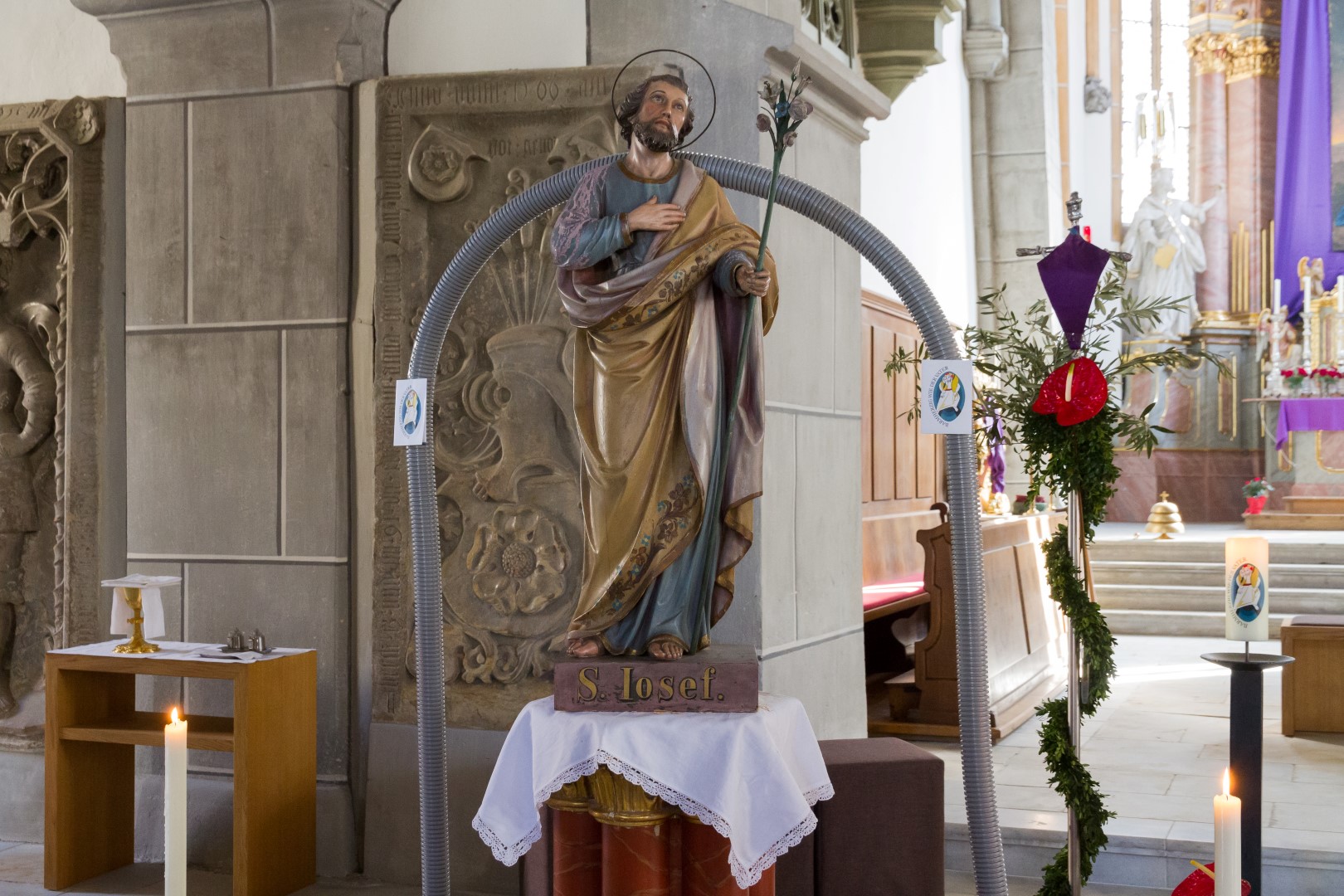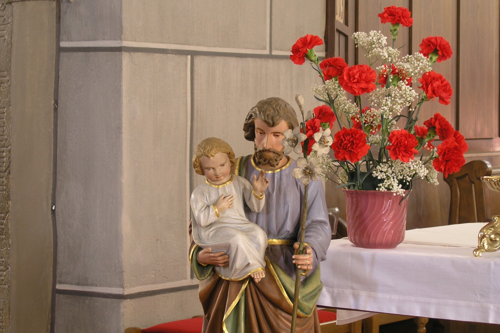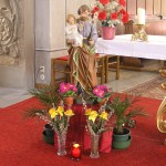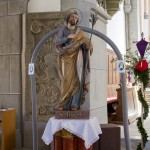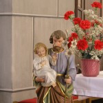 Geschmückte Statue des Hl. Josef mit dem Jesuskind und einer weißen Lilie als Symbol der Keuschheit bzw. Reinheit beim Volksaltar (© Herr Mag. Bernhard Wagner).