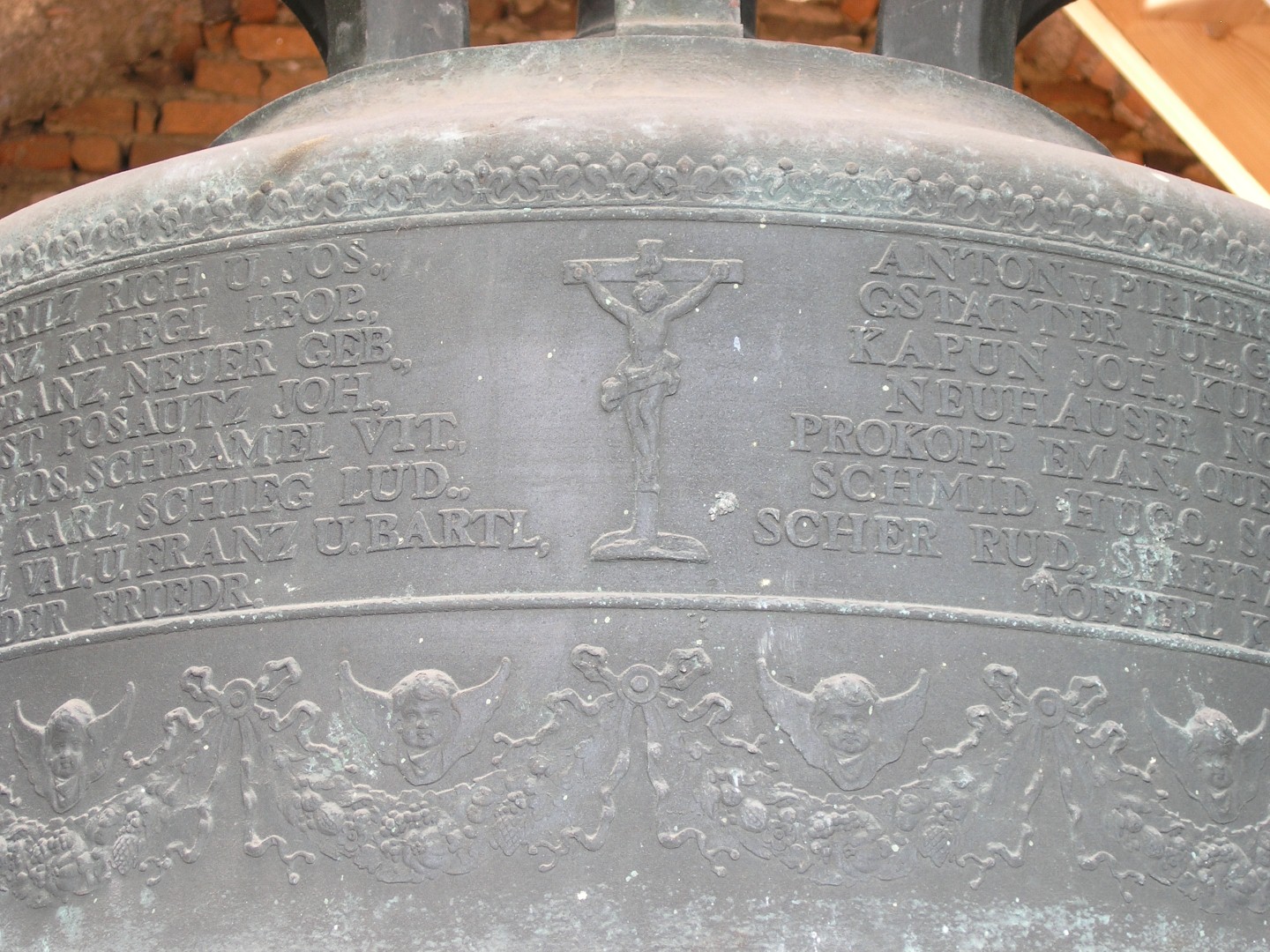 Cruxifix am oberen Glockenmantel. Auf gleicher Höhe die Namen der 109 Wolfsberger Gefallenen des 1. Weltkriegs (1914-1918). Darunter Girlanden mit Engelköpfen (© Herr Mag. Bernhard Wagner).