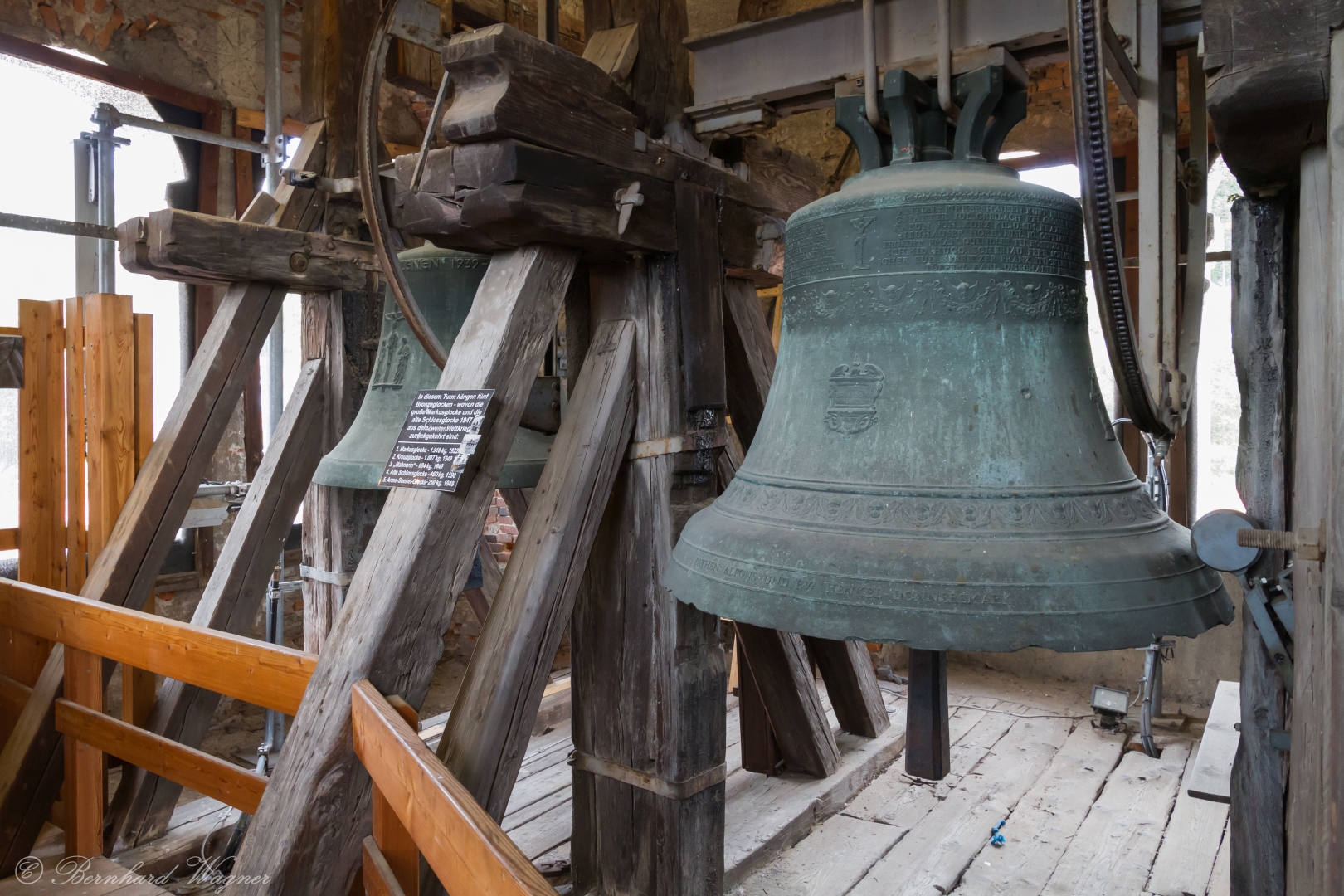 In der Glockenstube unterhalb der Türmerwohnung, am Bild die Markus- oder Heldenglocke (rechts) sowie die Gefallenen- oder Kreuzglocke (© Herr Mag. Bernhard Wagner).