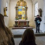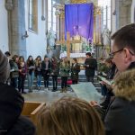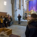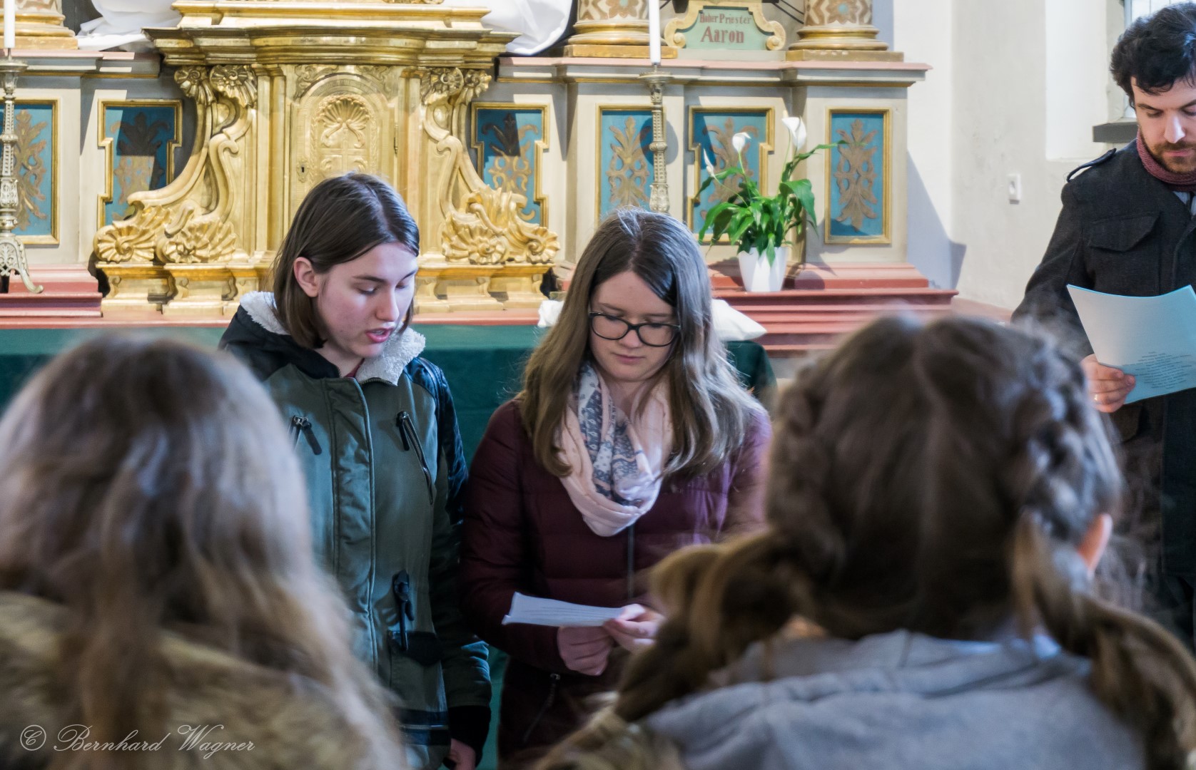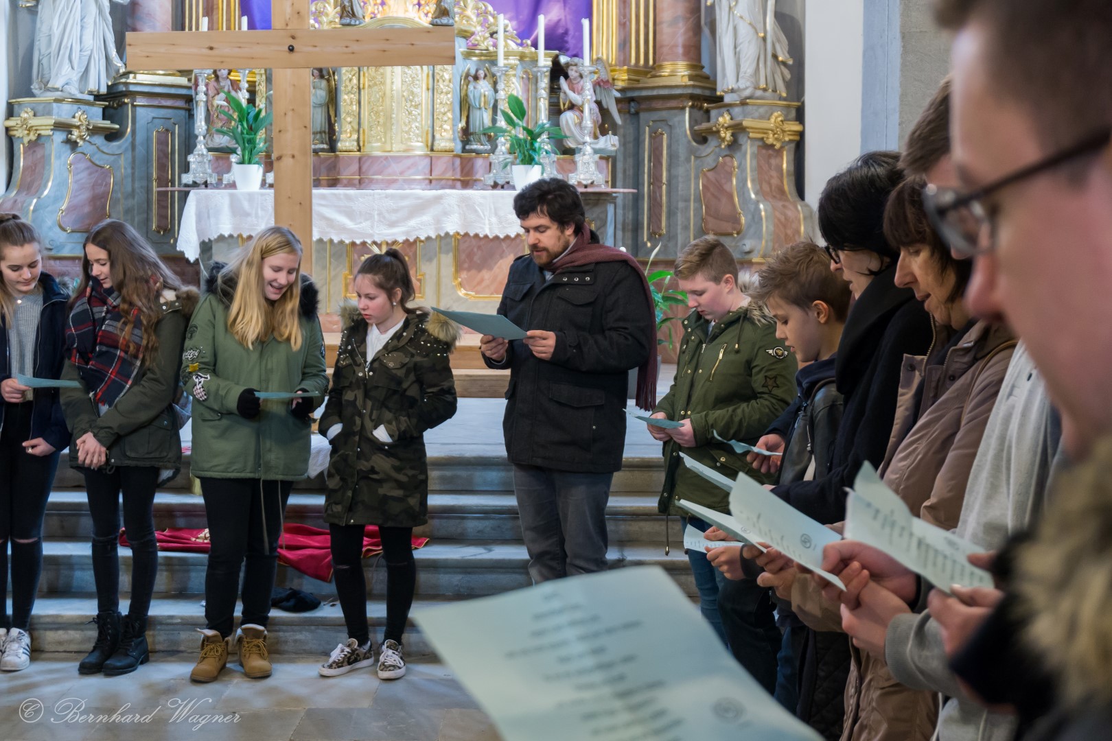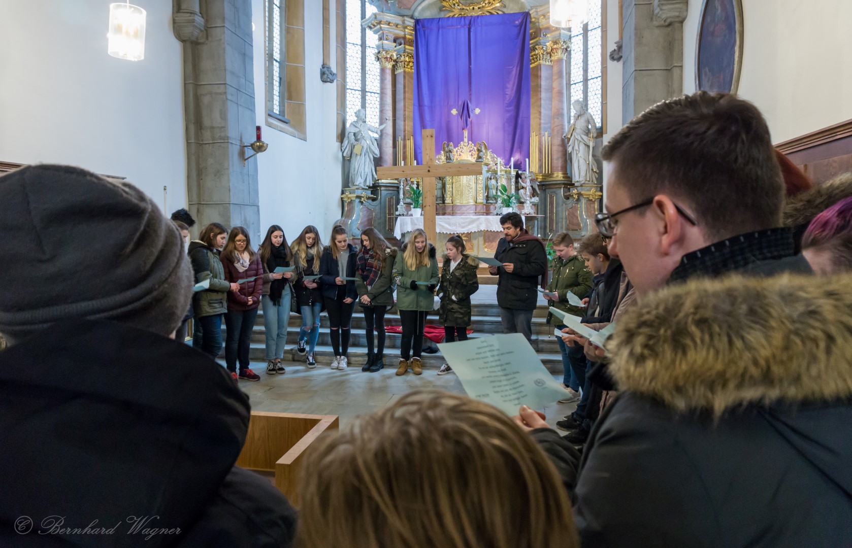 Zunächst versammelten sich die Anwesenden auf der Westseite der Stadtpfarrkirche St. Markus beim dortigen romanischen Portal und hörten nach der Begrüßung durch Herrn Mokoru schweigend dem Läuten der Markusglocke zur Todesstunde Christi um 15 Uhr zu. Sodann ging es auf die Südseite um dort das Gotteshaus beim Südeingang zu betreten und das Leiden Jesu in einer angepassten, jugendgerechten Form an insgesamt sechs Stationen mit zahlreicher Symbolik (Schüssel mit Wasser, Tuch, Dornenkrone usw.) sowie durch Firmlinge, Jugendliche des KathoJuz und Dekan Kollmann gelesene Texte zu betrachten.