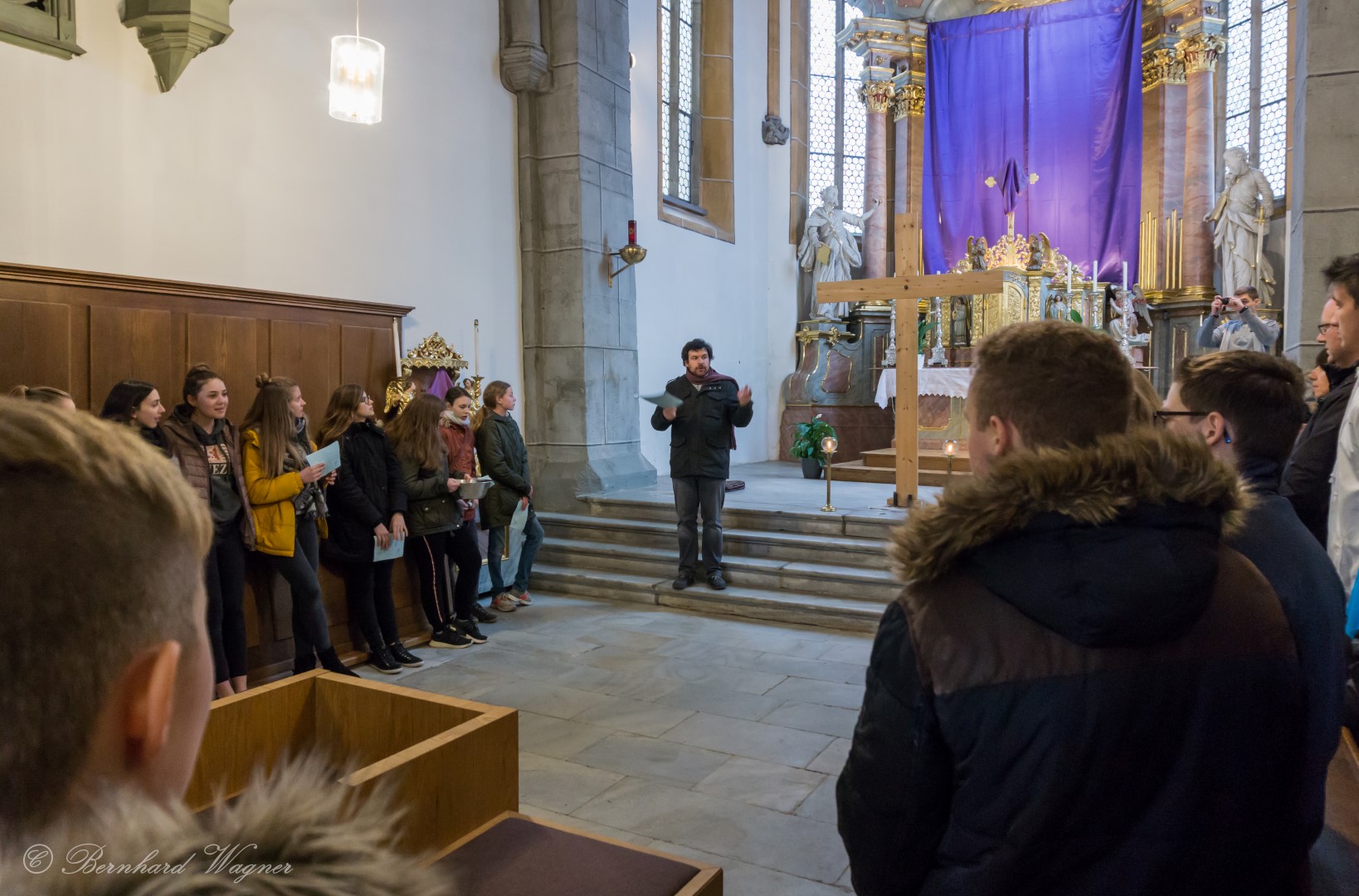Auch in diesem Jahr wurde von der Katholischen Jugend Lavanttal am Freitag vor dem Palmsonntag, diesmal war es der 23. März, der Jugendkreuzweg veranstaltet. Regionaljugendleiter Herr Jakob Mokoru, BEd tat dies gemeinsam mit Kaplan Mag. Dr. Christoph Kranicki und Dekan Pater Mag. Marian Kollmann OSB vom Benediktinerstift St. Paul im Lavanttal. Neben zahlreichen Firmlingen auch aus dem oberen Lavanttal mit Pfarrprovisor Mag. Martin Edlinger fanden sich die Firmgruppenleiterinnen Frau Monika Wuggenig, Frau Claudia Cufer und Frau Maria Traussnig sowie Jugendliche aus dem Katholischen Jugendzentrum Avalon ein, unter ihnen natürlich Zivildiener Herr Christoph Isopp. Des weiteren sah man auch einige weitere interessierte Erwachsene.