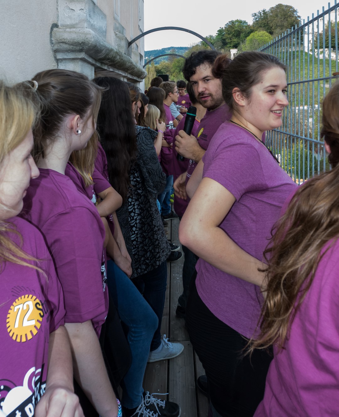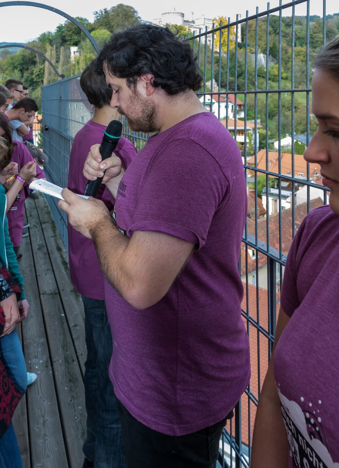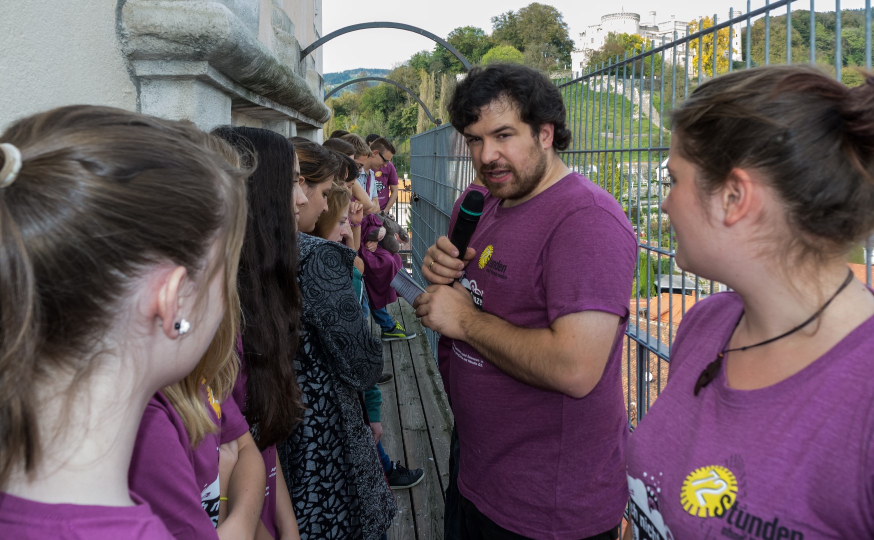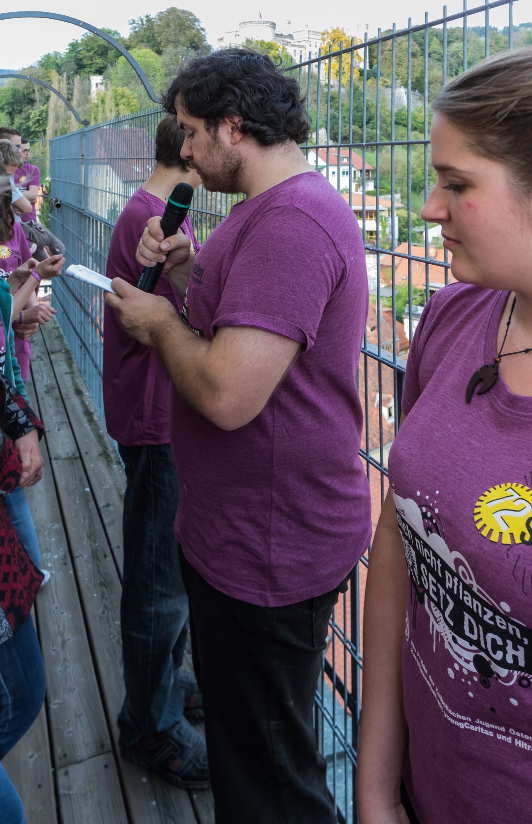 Wenige Minuten vor 15 Uhr versammeln sich die Jugendlichen gemeinsam mit Regionaljugendleiter Jakob, Zivi Marco und den ProjektleiterInnen im Inneren des Stadtpfarrturms um sodann zum Turmbalkon aufzusteigen (© Herr Mag. Bernhard Wagner).