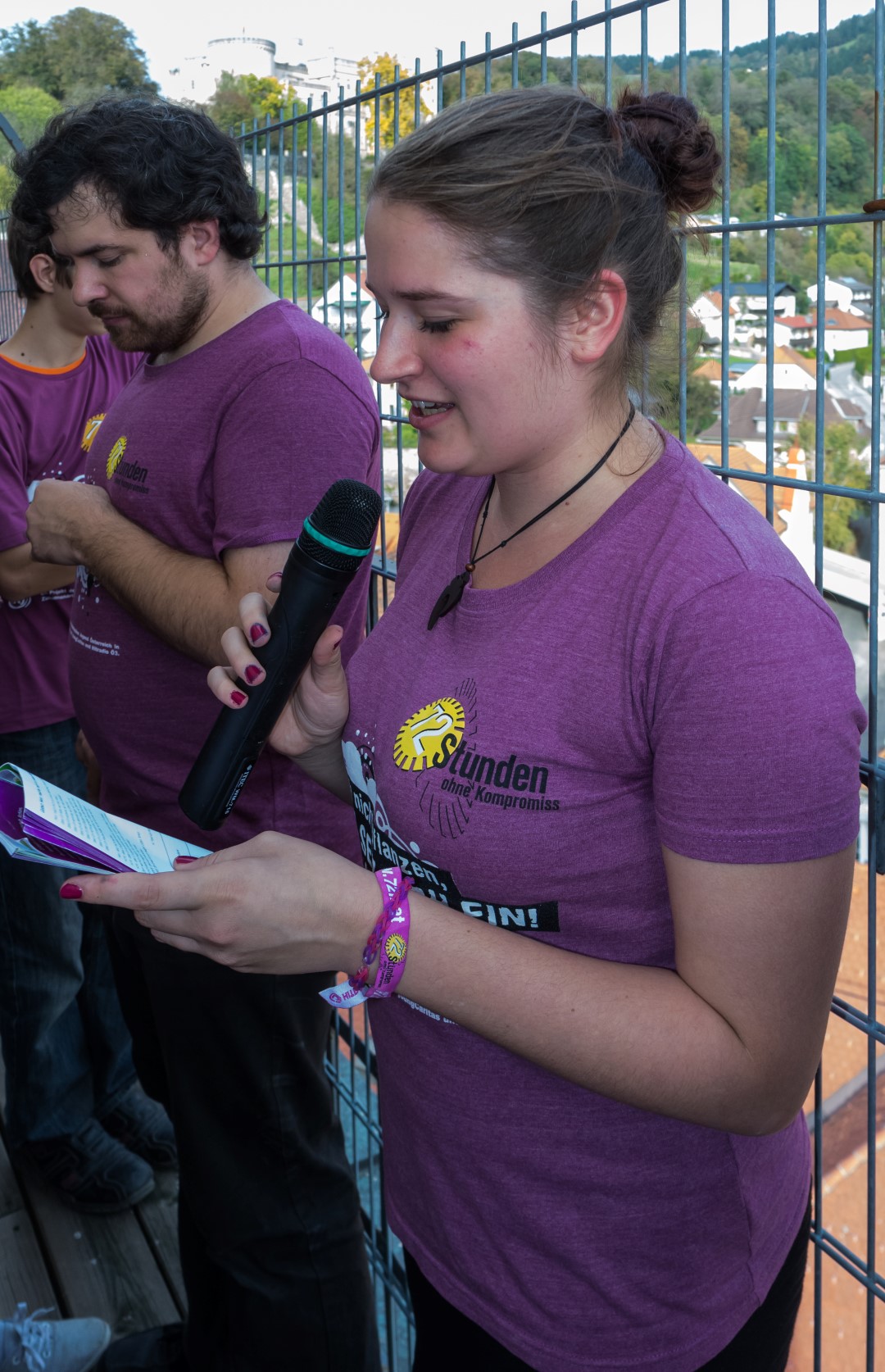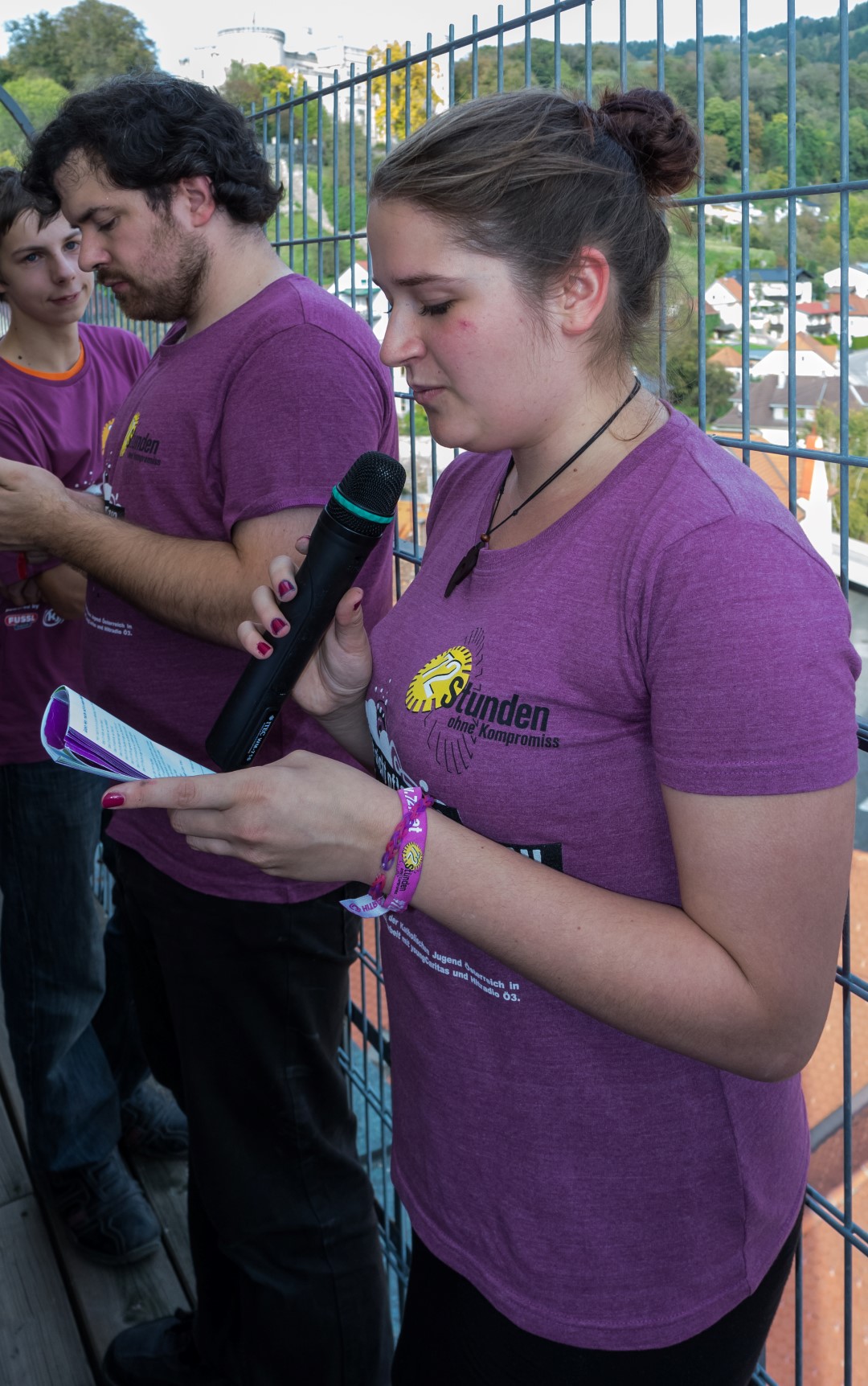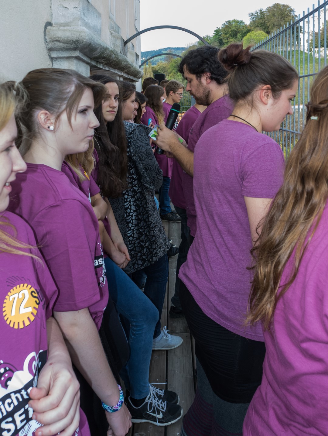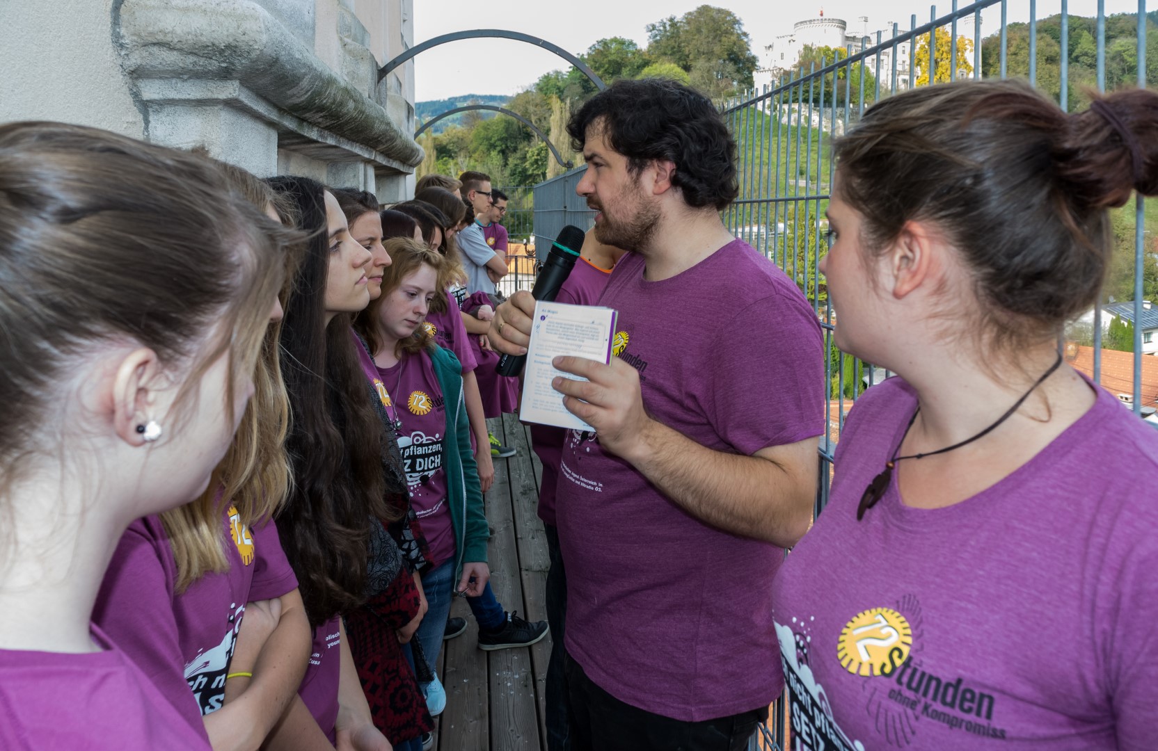 Wenige Minuten vor 15 Uhr versammeln sich die Jugendlichen gemeinsam mit Regionaljugendleiter Jakob, Zivi Marco und den ProjektleiterInnen im Inneren des Stadtpfarrturms um sodann zum Turmbalkon aufzusteigen (© Herr Mag. Bernhard Wagner).
