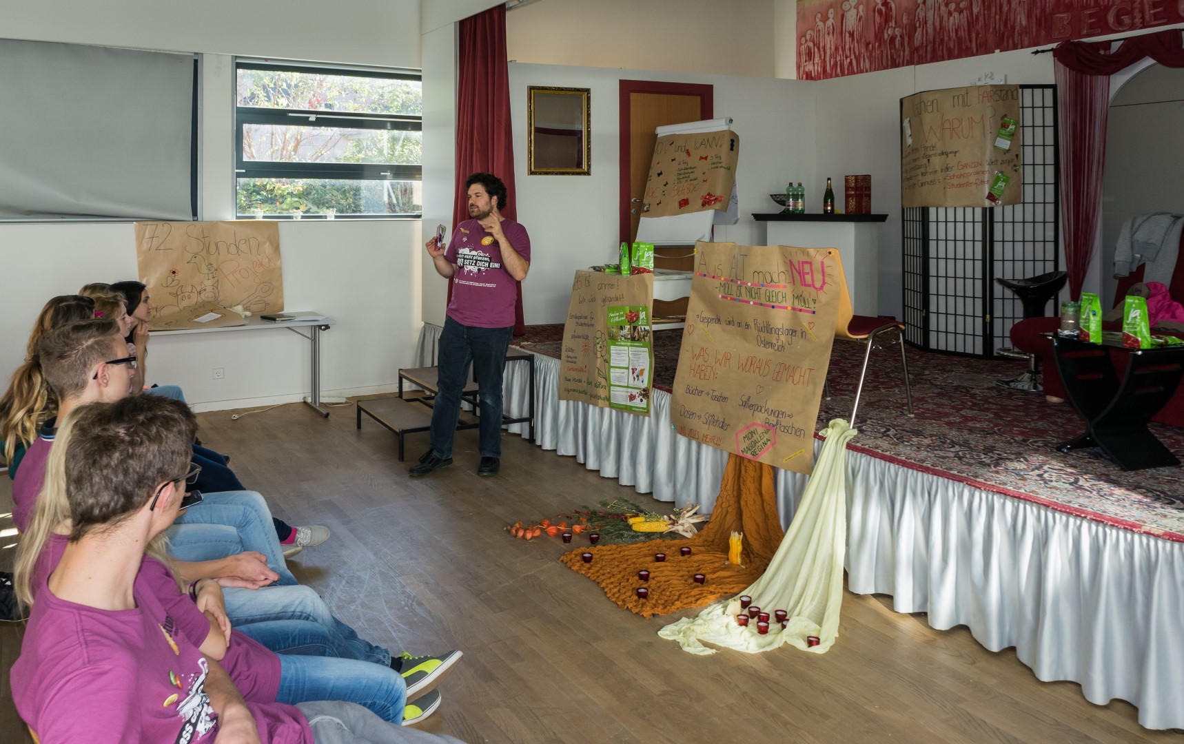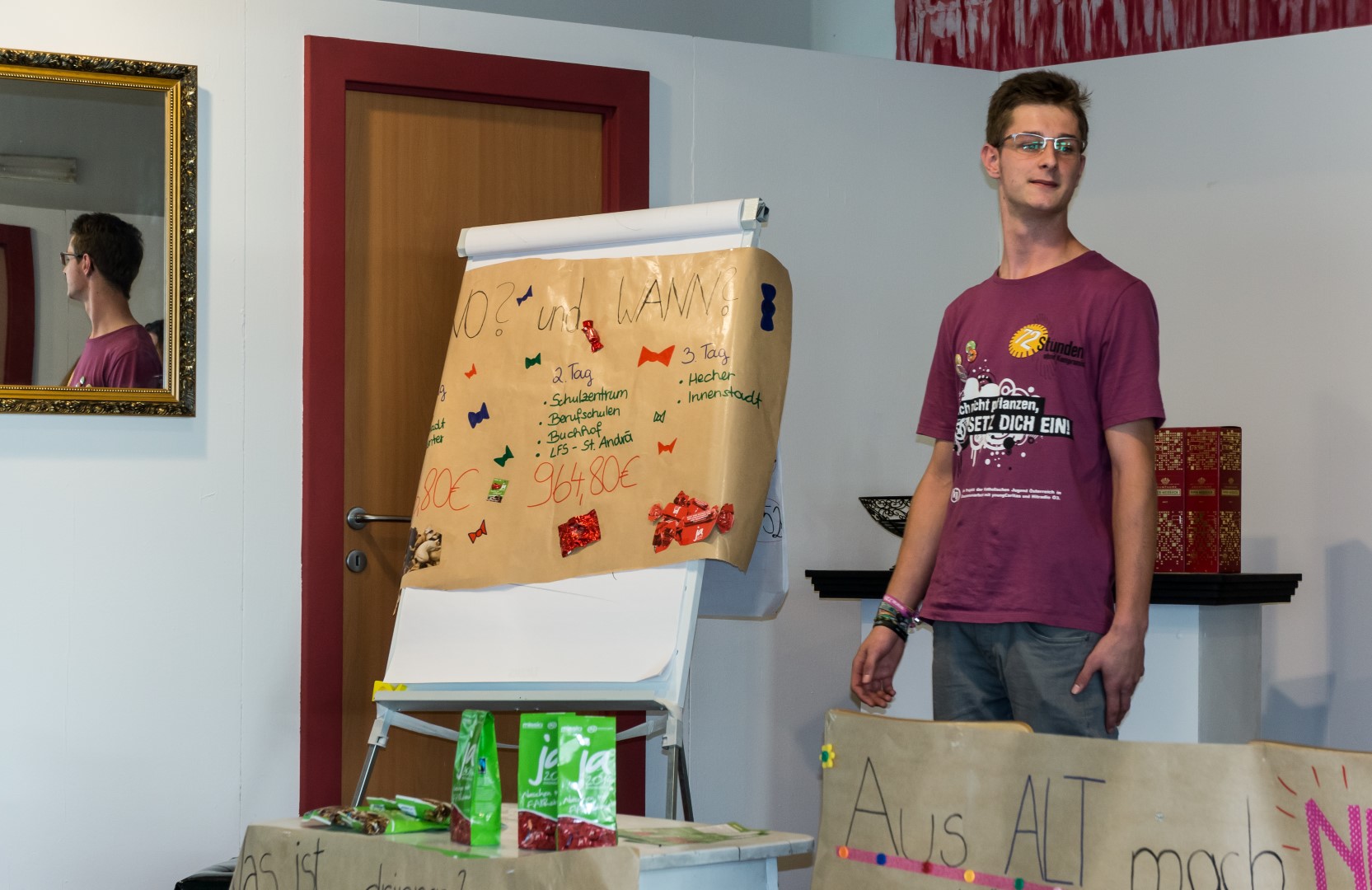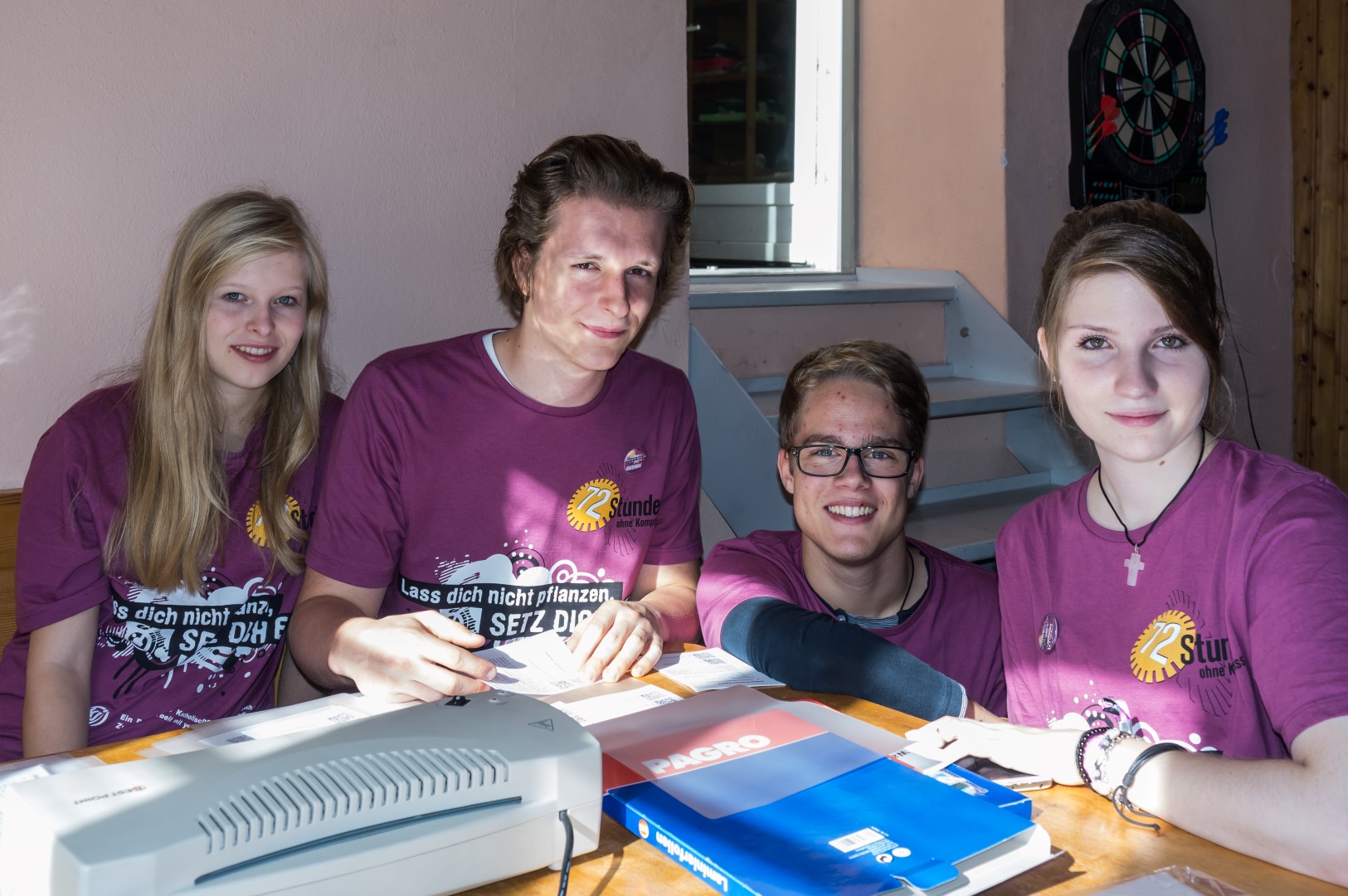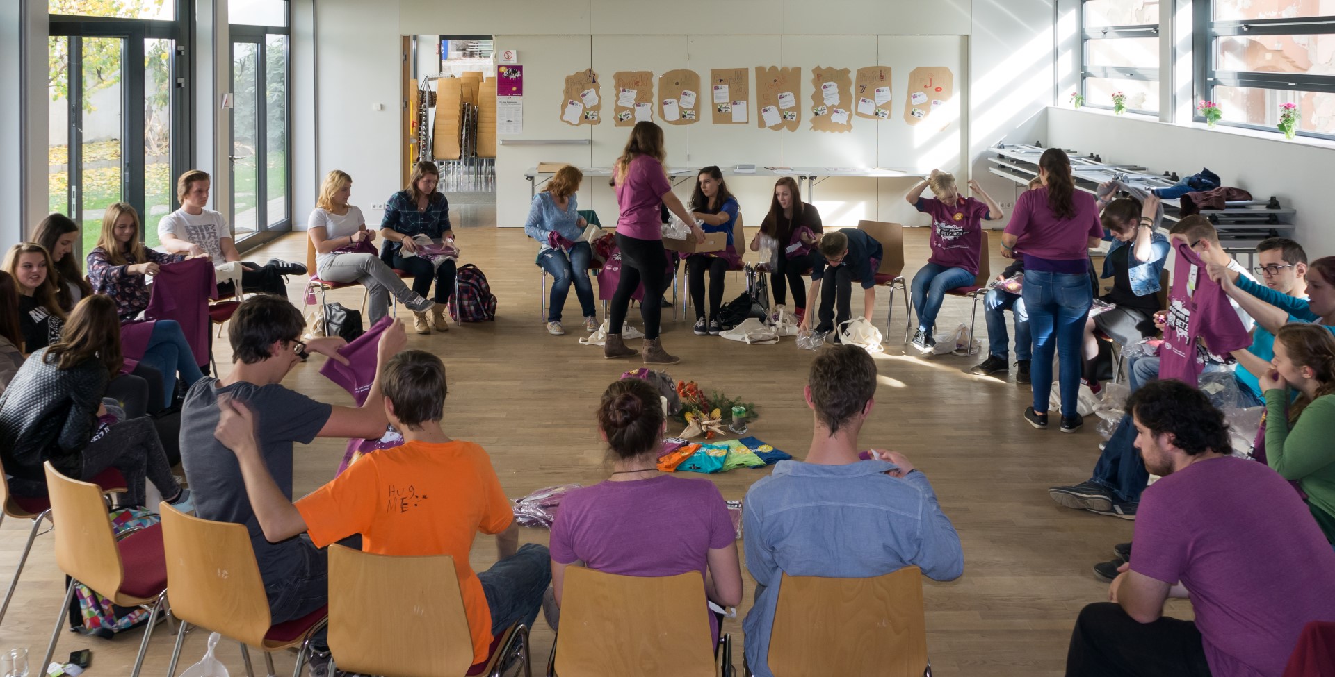 Jetzt erhalten alle die typischen 72 Stunden-Leiberl, diesmal in der Farbe Violett, dazu Stoffsackerl mit zum Sozialprojekt passenden Inhalt. Im Hintergrund sieht man an der Wand die Projektbeschreibungen (© Herr Mag. Bernhard Wagner).