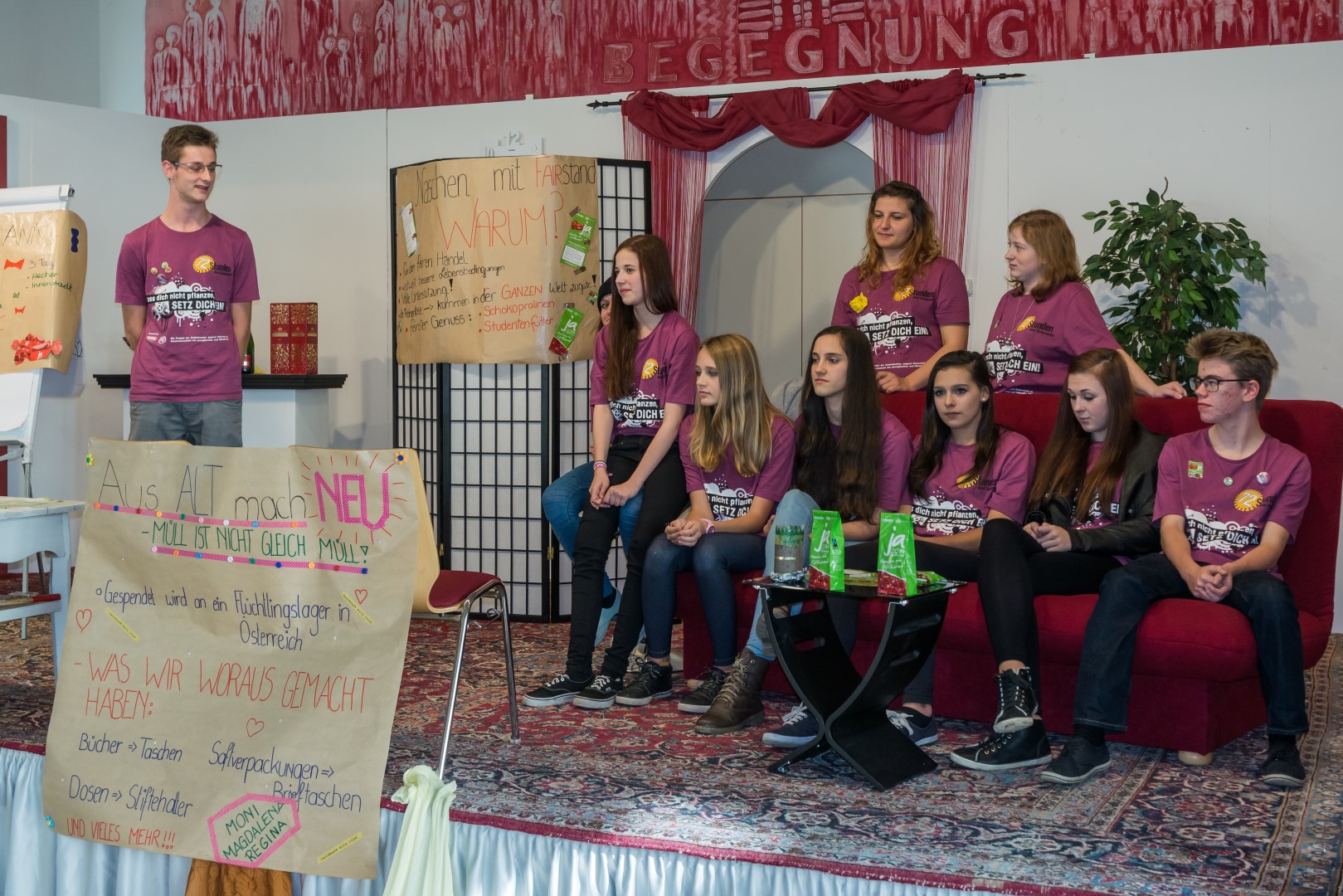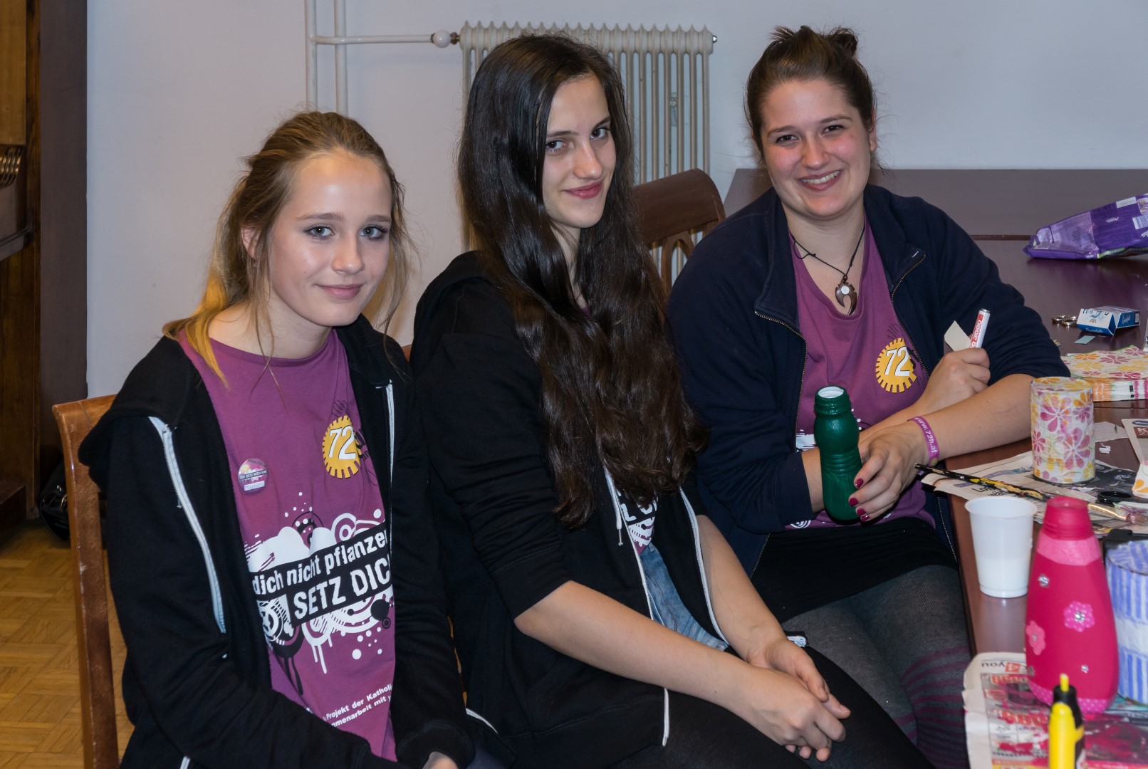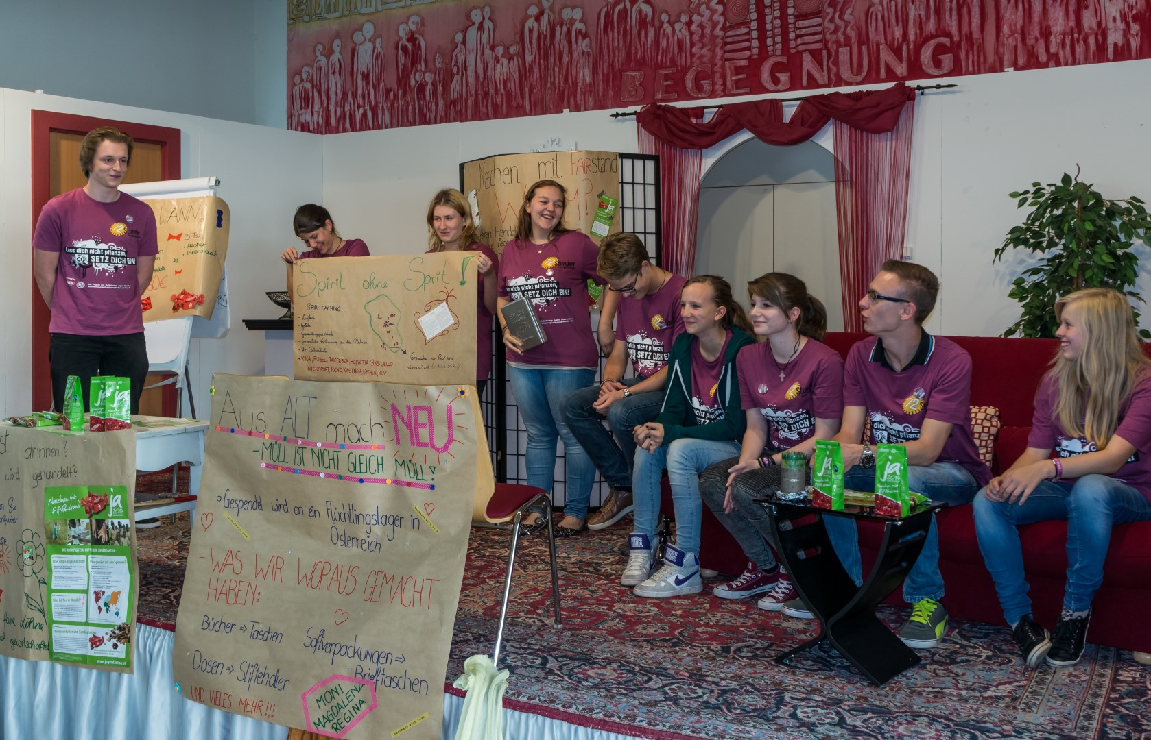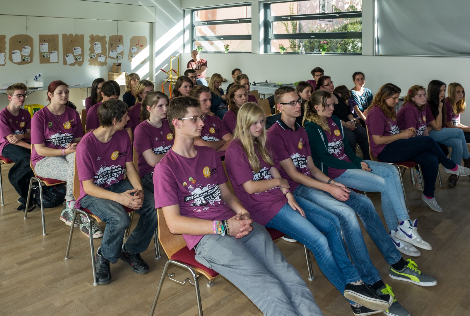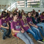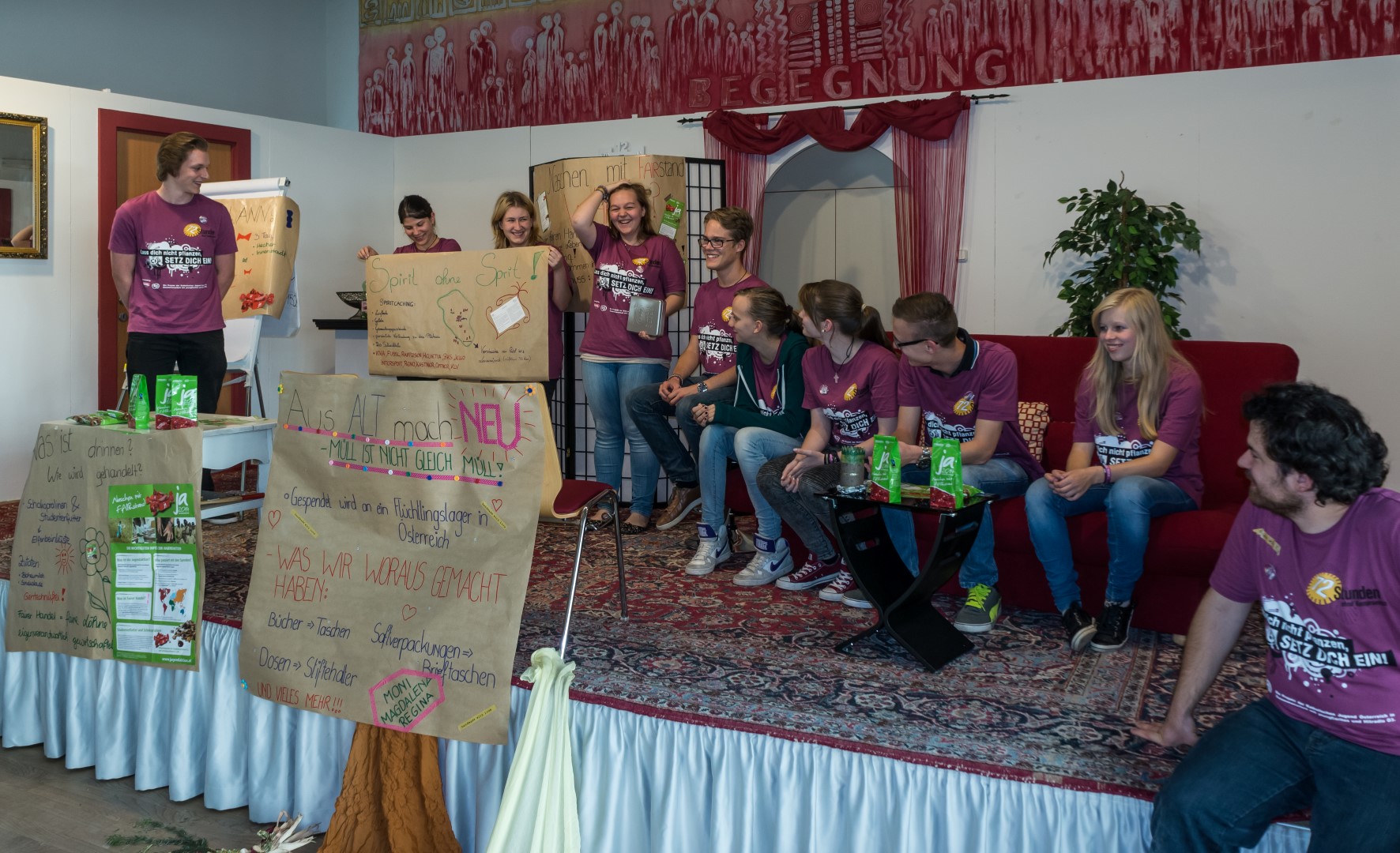 Jetzt erhalten alle die typischen 72 Stunden-Leiberl, diesmal in der Farbe Violett, dazu Stoffsackerl mit zum Sozialprojekt passenden Inhalt. Im Hintergrund sieht man an der Wand die Projektbeschreibungen (© Herr Mag. Bernhard Wagner).