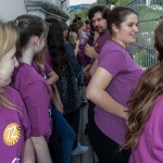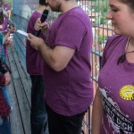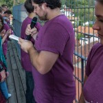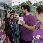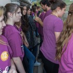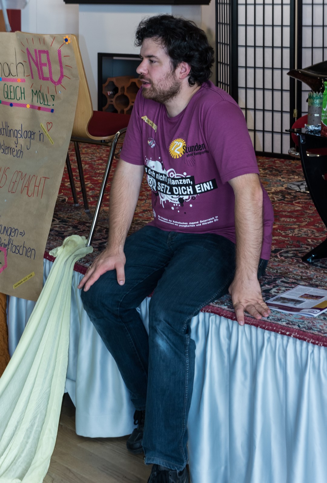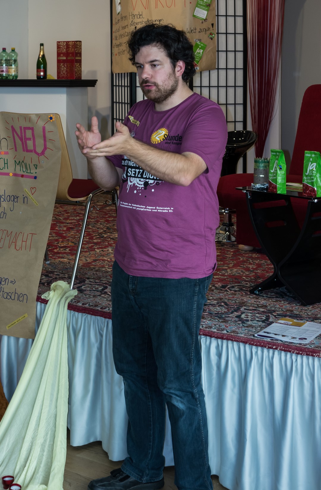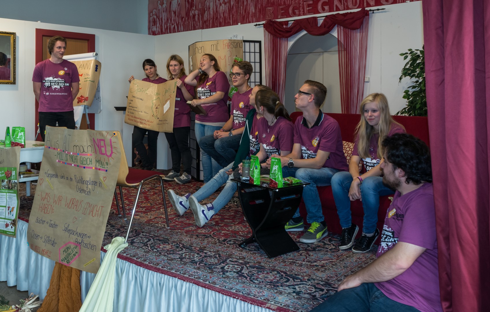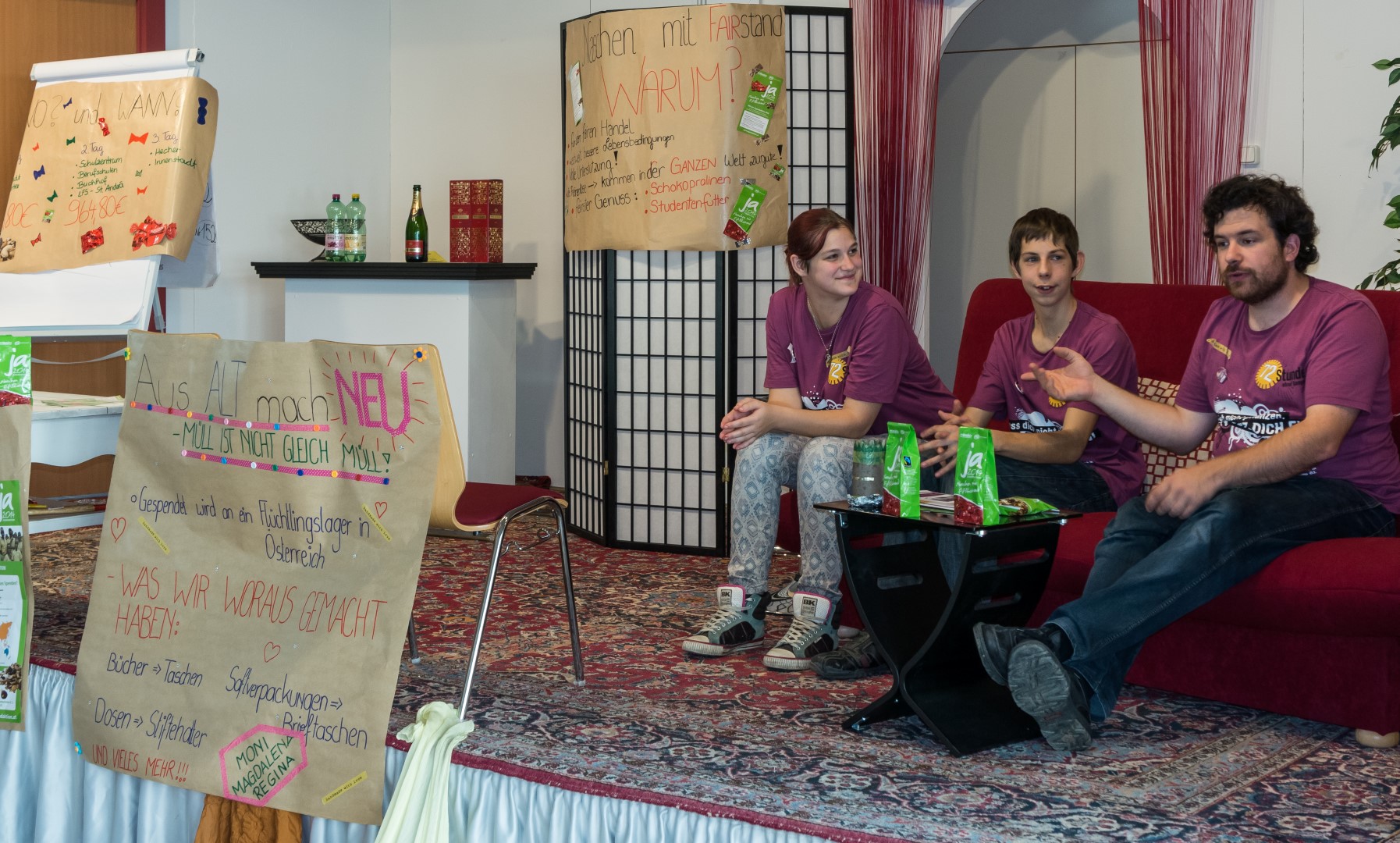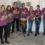 Jetzt erhalten alle die typischen 72 Stunden-Leiberl, diesmal in der Farbe Violett, dazu Stoffsackerl mit zum Sozialprojekt passenden Inhalt. Im Hintergrund sieht man an der Wand die Projektbeschreibungen (© Herr Mag. Bernhard Wagner).