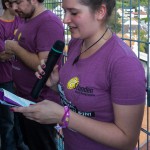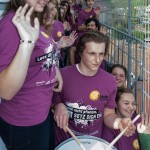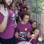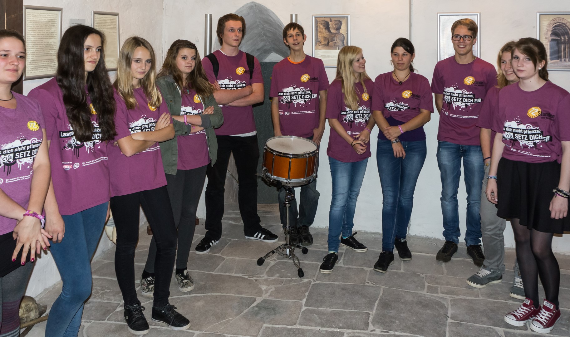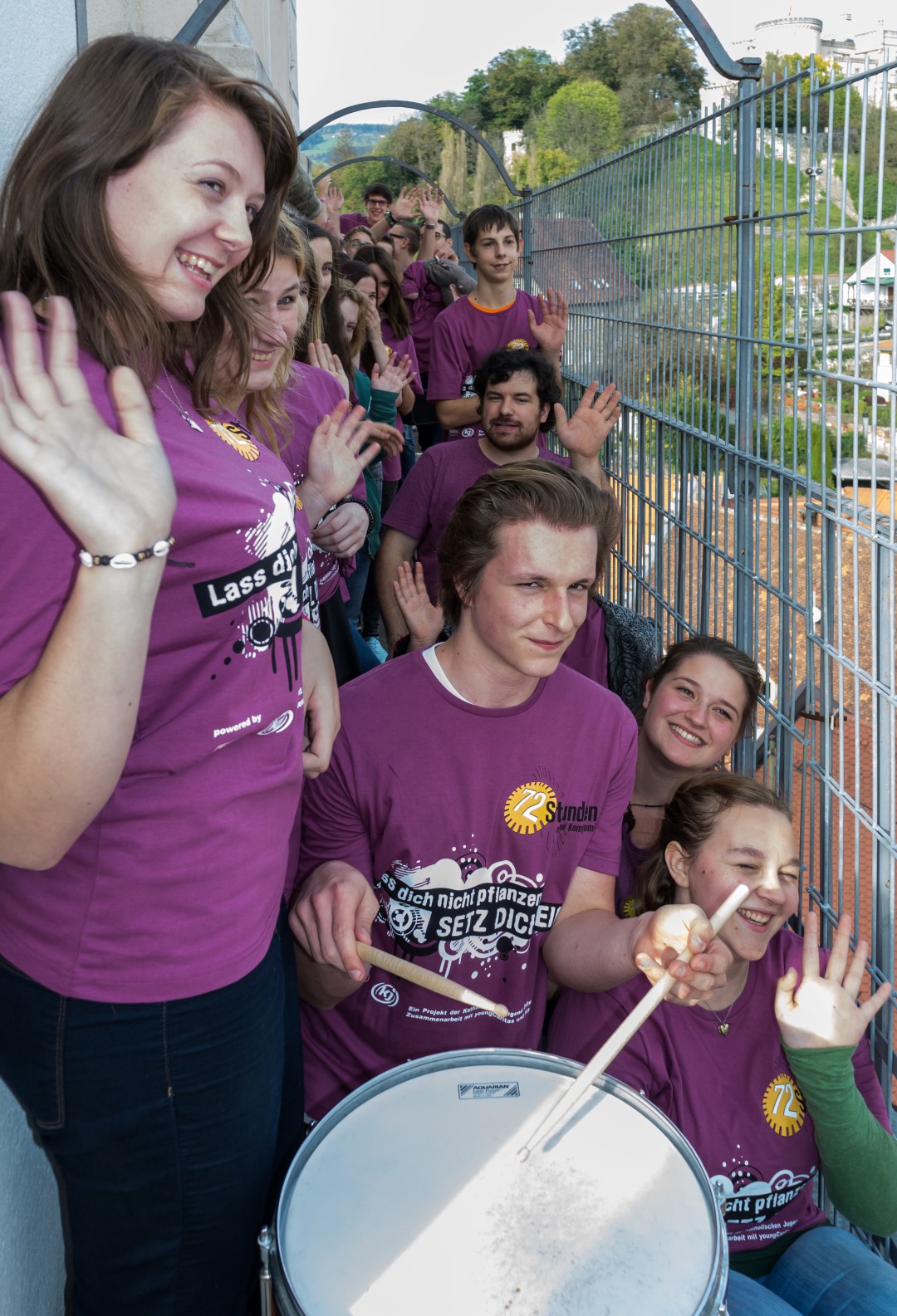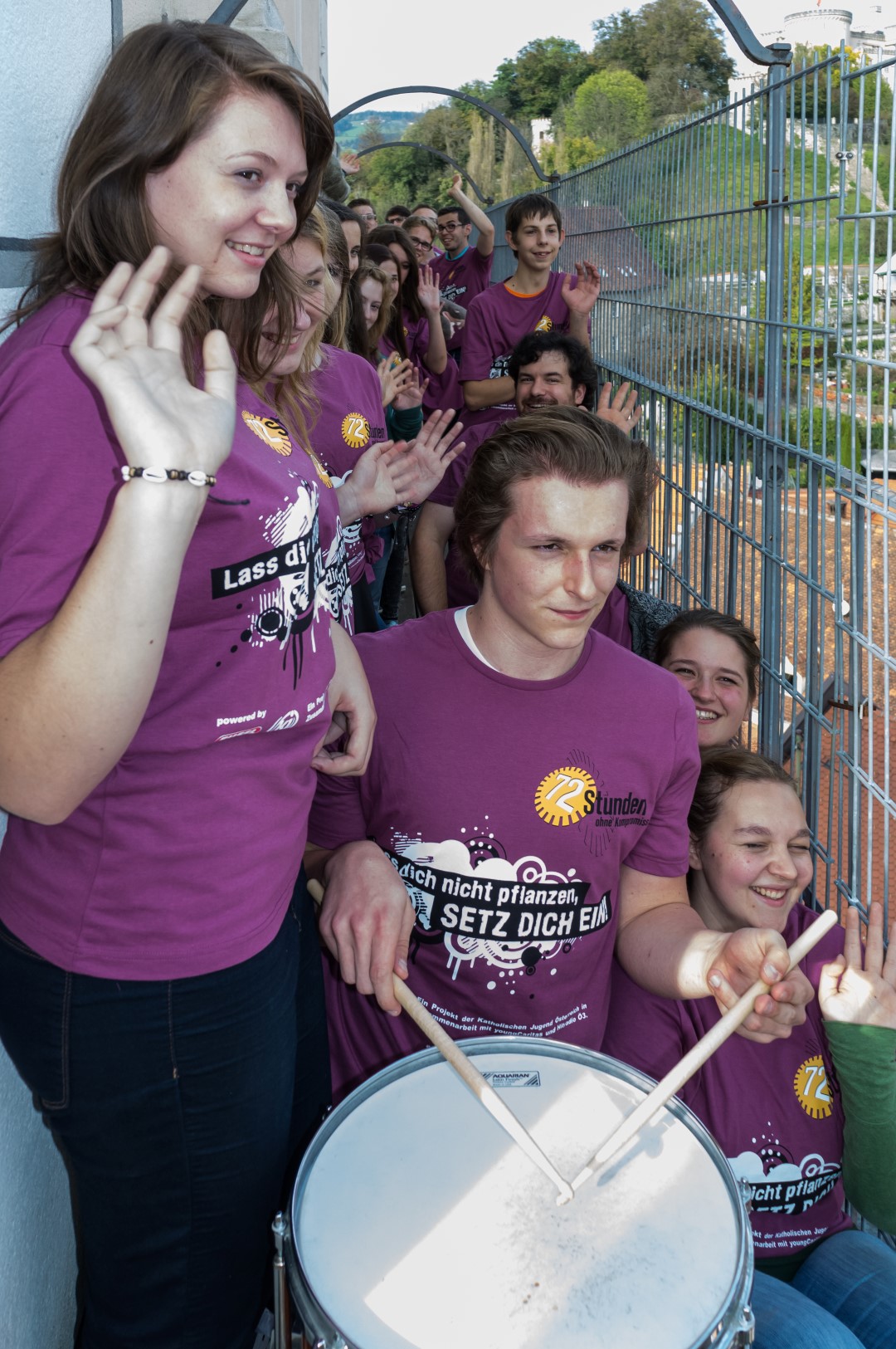 Schließlich schreitet man zur eigentlichen Eröffnung, wobei Zivi Marco in seiner Eigenschaft als Schlagzeuger mit Trommelschlägen beginnt und die Jugendlichen hernach das Motto des Sozialprojektes „72 Stunden ohne Kompromiss“ 2014, „Lass dich nicht pflanzen, SETZ DICH EIN!“, rufen (© Herr Mag. Bernhard Wagner).