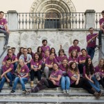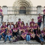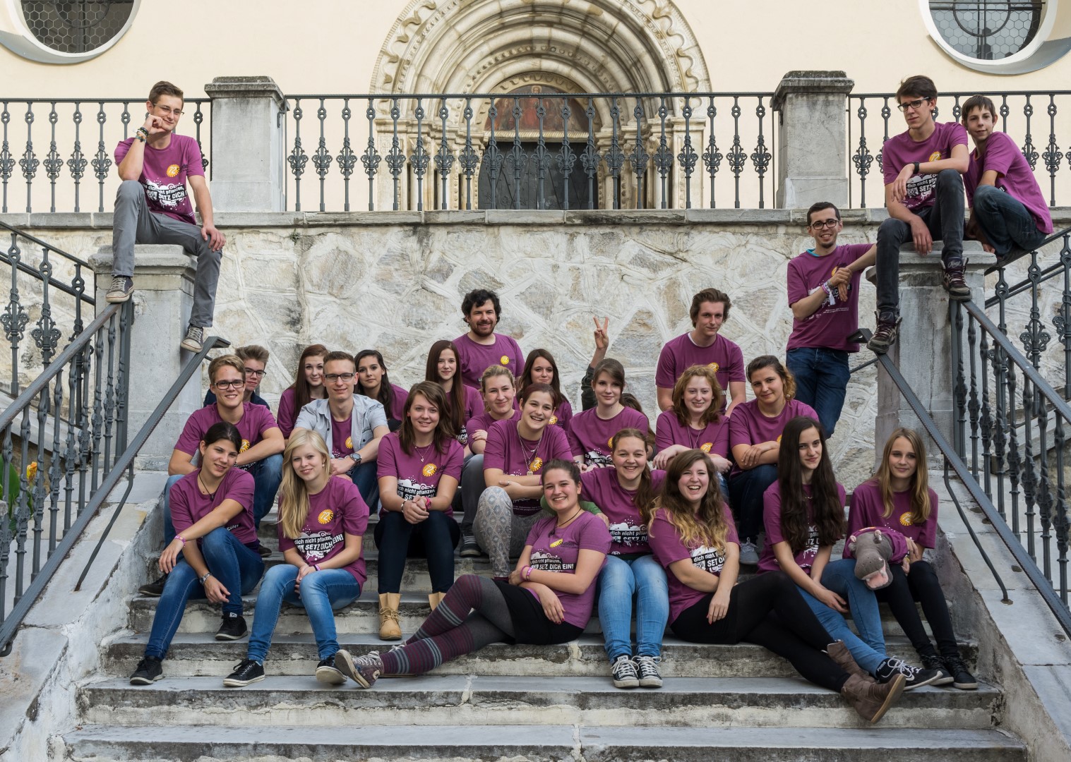 Gruppenfoto der Teilnehmerinnen und Teilnehmer am Sozialprojekt auf der Schulstiege, im Hintergrund das Hauptportal der Markuskirche (© Herr Mag. Bernhard Wagner).
