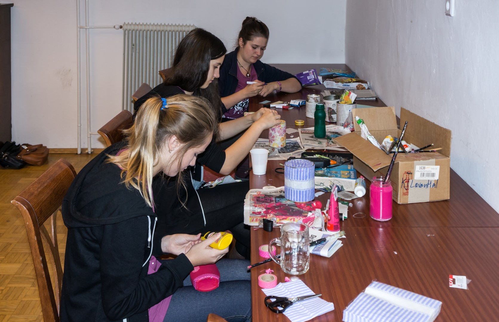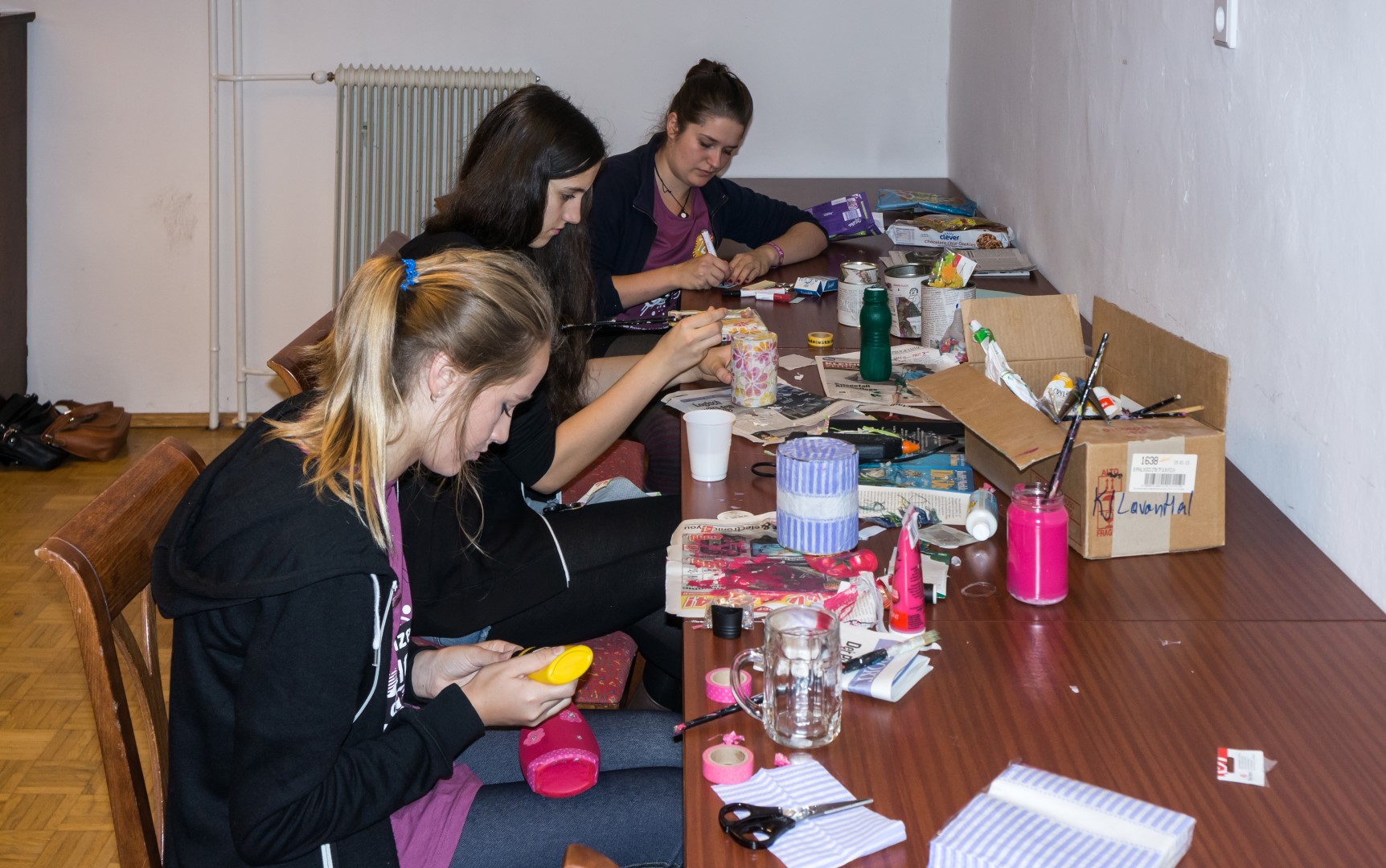 … bastelt hier gemeinsam mit zwei Jugendlichen aus wiederverwertbarem Müll wie etwa Plastikflaschen oder Dosen nette Geschenke (© Herr Mag. Bernhard Wagner).