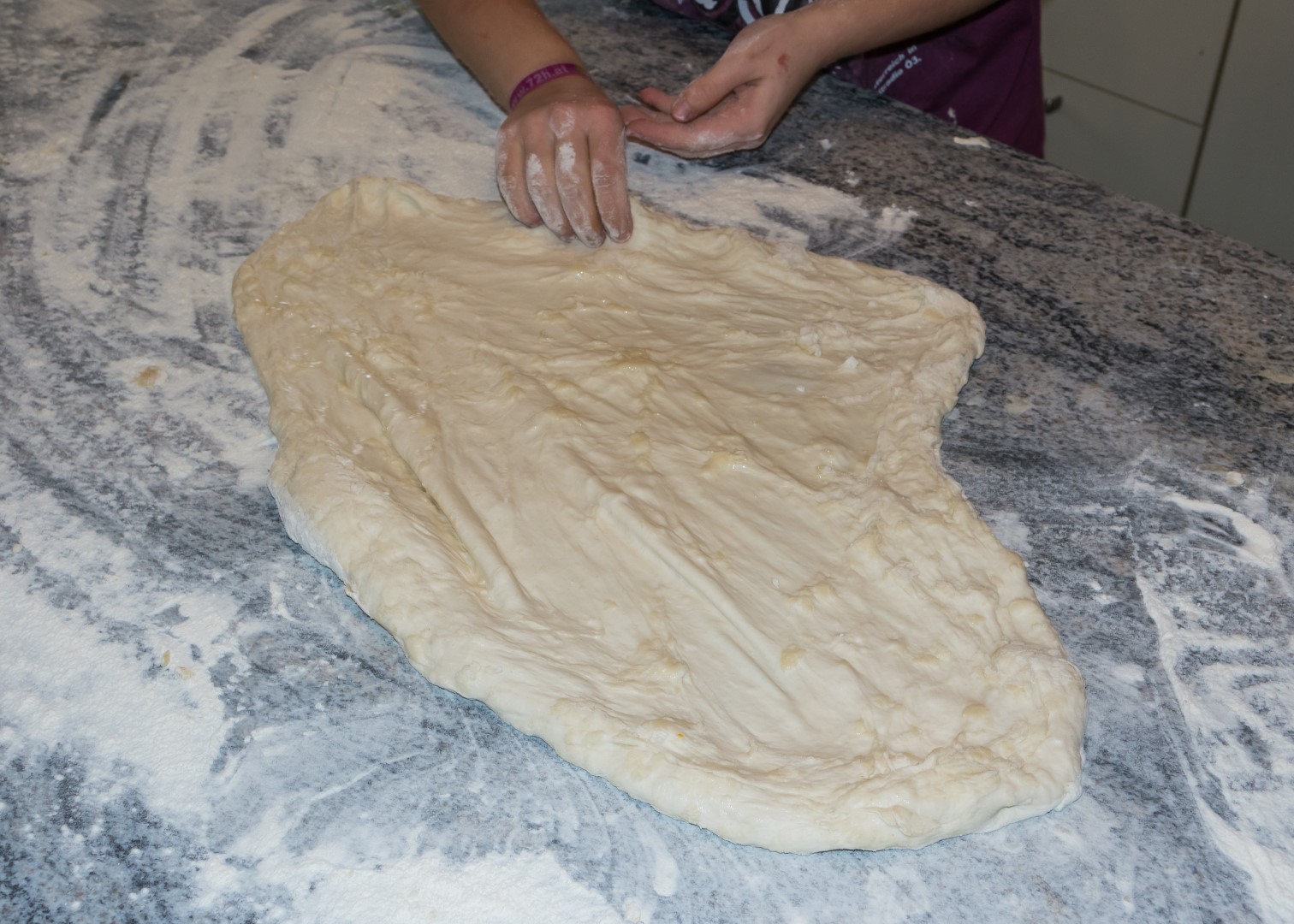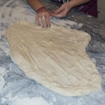 … und die Teigmasse wenig später auch schon ausgezogen wobei darauf geachtet wird, dass möglichst keine Löcher entstehen (© Herr Mag. Bernhard Wagner).