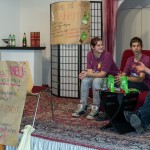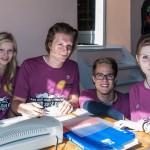 Projekt „SPIRIT ohne SPRIT“ — Im nahen Avalon ist man währenddessen um Zivildiener Herrn Marco Mrčela (Mitte links) damit beschäftigt, Kärtchen mit Gebetstexten zu erstellen und zu laminieren welche in weiterer Folge in die vorgesehenen Boxen für das SpiriCaching gegeben werden (© Herr Mag. Bernhard Wagner).