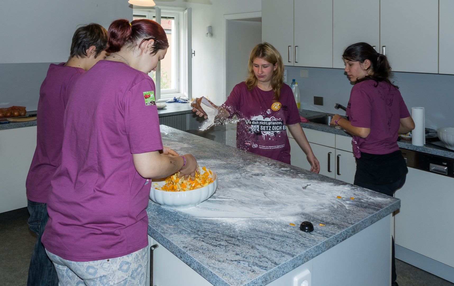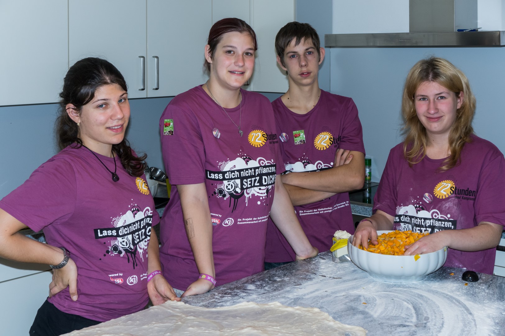 Projekt „Nur ein/e satte/r ArbeiterIn“ — Alle Teilnehmerinnen und Teilnehmer von „72 Stunden ohne Kompromiss“ wollen natürlich auch essen. Hier bereiten in der Pfarrhofküche drei Mädchen und Pascal Kogler gerade das Mittagessen dieses Arbeitstages zu (© Herr Mag. Bernhard Wagner).