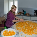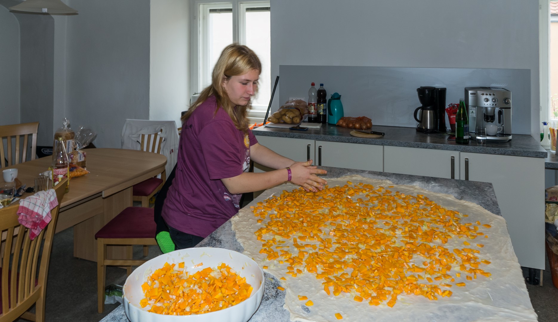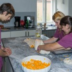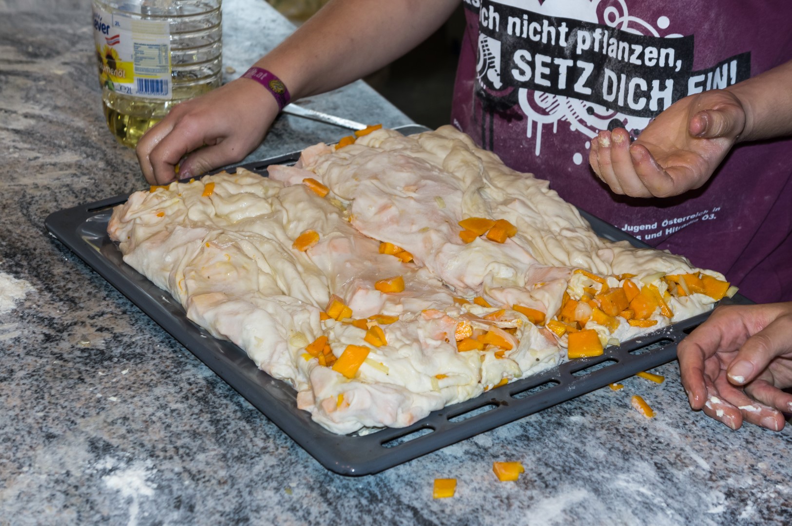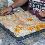 Diesmal gibt es einen Strudel (bosnische Pita) mit Kürbisstücke- und Kartoffel-Füllung. Eines der Mädchen verteilt die Kürbisstücke am ausgezogenen Strudelteig … (© Herr Mag. Bernhard Wagner)