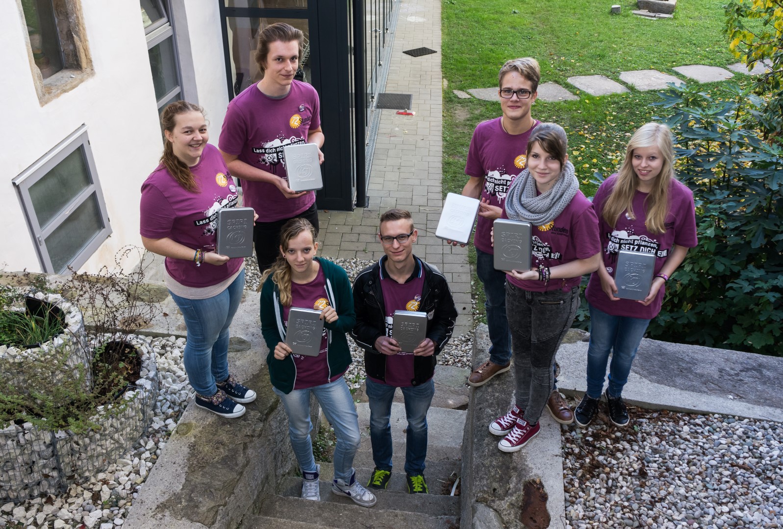 Projekt „SPIRIT ohne SPRIT“ — Zivildiener Herr Marco Mrčela (links hinten), Frau Pia Urban (ganz links) und die Jugendlichen dieses Projektes mit den fertigen SpiriCaching-Boxen vor deren Verteilung (© Herr Mag. Bernhard Wagner).