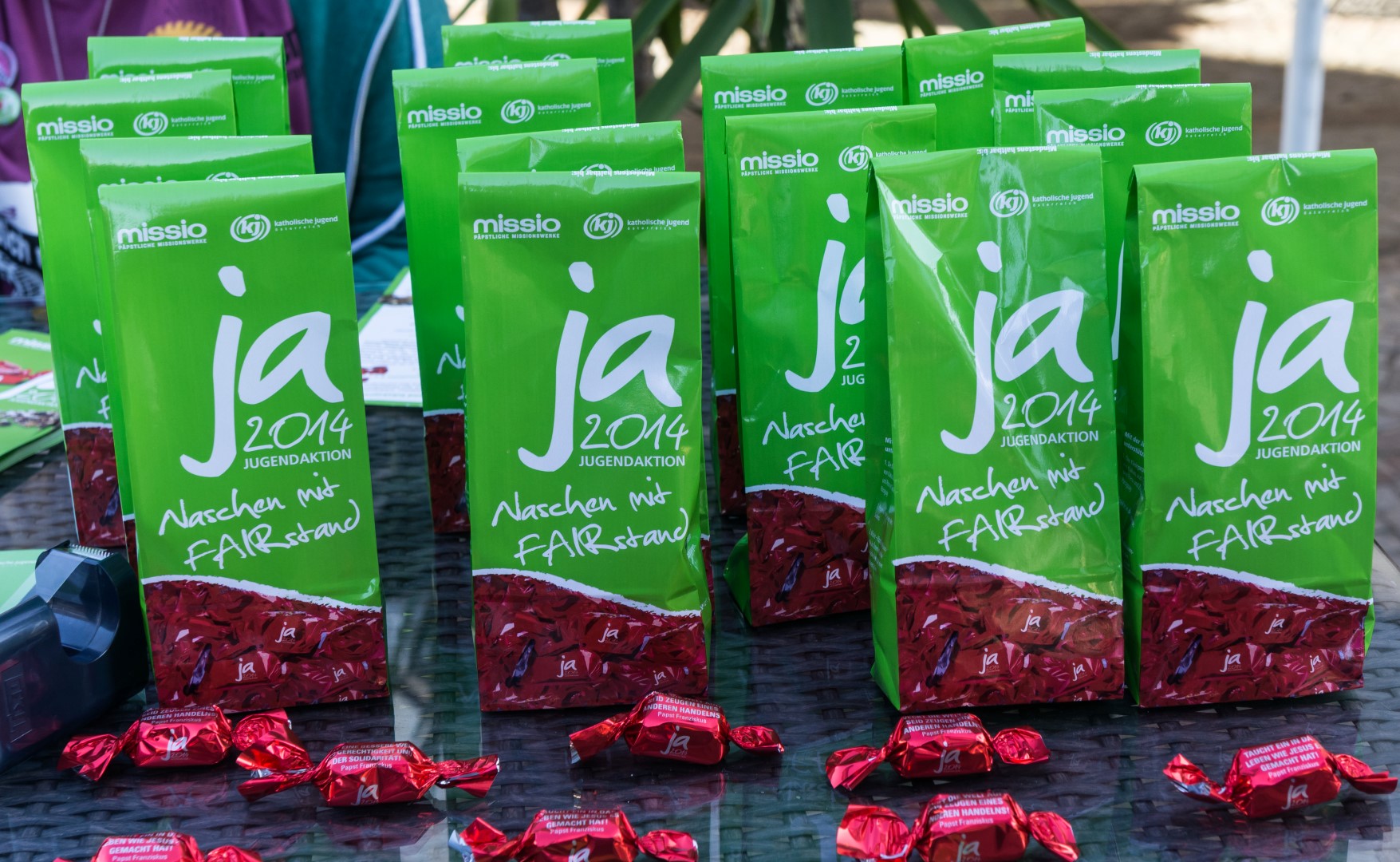 Die Sackerl mit den Schoko-Pralinen von denen man einige im Vordergrund sieht. Auf jeder Pralinenfolie findet sich ein Zitat von Papst Franziskus (© Herr Mag. Bernhard Wagner).