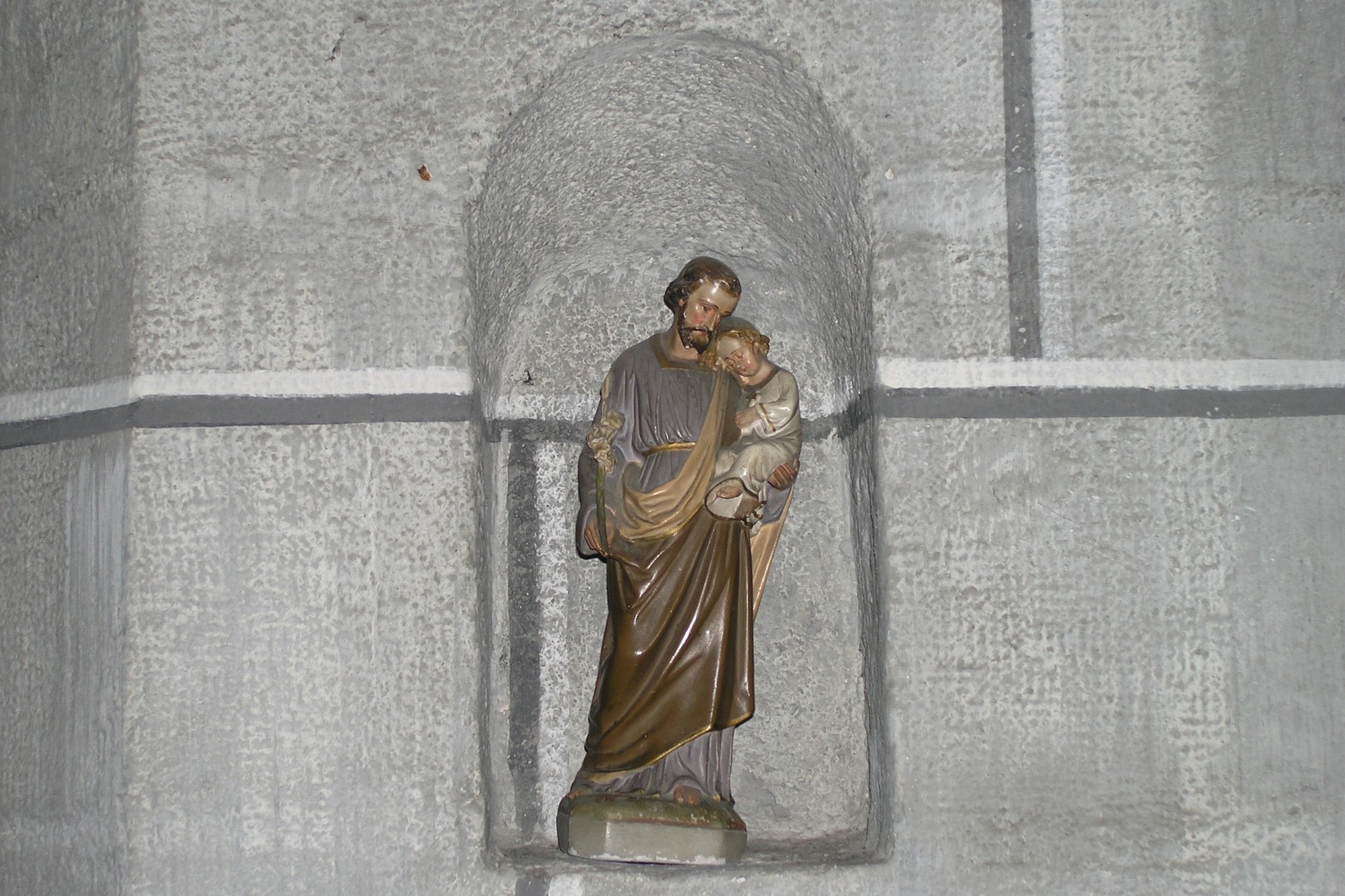 Kleine Statue des Hl. Josef mit dem Jesuskind in einer Nische im von vorne gesehen dritten Pfeiler des südlichen Seitenschiffes (© Herr Mag. Bernhard Wagner).