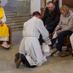 Im Anschluss fand im Presbyterium der Kirche eine symbolische Fußwaschung an zwölf Personen der Pfarre statt, es waren dies Pfarrgemeinderätinnen und Pfarrgemeinderäte, Lektorinnen und Lektoren sowie zwei Ministrantinnen, entsprechend den zwölf Jüngern. Dieser bei uns mittlerweile schon seit langem übliche Ritus erinnert die Gemeinde an jene Fußwaschung, die Jesus im Abendmahlsaal vollzog.