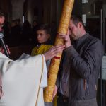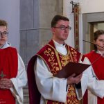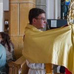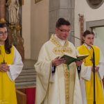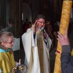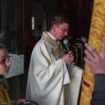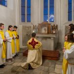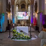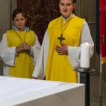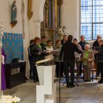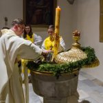 Selbige als dritter Teil der Osternachtliturgie begann mit einer Prozession von Provisor Kranicki und den Ministranten durch das Hauptschiff der Kirche hin zum Portal und von dort das nördliche Seitenschiff entlang zur Seitenkapelle neben dem Eingang zur Turmkapelle wo sich das Taufbecken befindet welches bereits geöffnet und mit Wasser gefüllt war. Derweil wurde die Allerheiligenlitanei gesungen. Es folgten die Segensworte zur Segnung des Wassers und das eindrucksvolle Eintauchen der mitgeführten Osterkerze in das gesegnete Wasser. Dabei spricht der Priester „Durch deinen geliebten Sohn steige herab in dieses Wasser die Kraft des Heiligen Geistes“. Daraufhin erneuerte man das Taufversprechen und beim Lied „Fest soll mein Taufbund immer stehn“ ging der Provisor durch die Kirche um die Gläubigen mit Weihwasser zu besprengen.