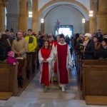 Schließlich zogen Provisor Kranicki und die Ministranten mit der brennenden Osterkerze in die dunkle Kirche ein und schritten langsam den Mittelgang hinauf zum Volksaltar. Unterwegs gab es drei Stationen bei denen er den Ruf „Lumen Christi“, in der deutschen Fassung: „Christus das Licht“, sang. Für die Gläubigen waren eigene kleine Osterkerzen in Bechern vorbereitet und jene, die beim Einzug in den Bankreihen neben dem Gang standen, konnten das Osterlicht direkt von der Osterkerze übernehmen, die anderen wiederum bekamen es von ihren jeweiligen Nachbarinnen und Nachbarn dargereicht sodass sich der Kirchenraum in eindrucksvoller Weise rasch mit brennenden Lichtern erfüllte.